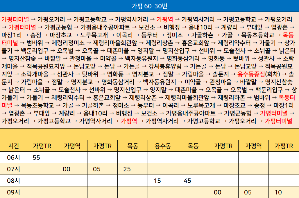 가평 60-30번: 가평터미널 → 가평오거리 → 가평고등학교 → 가평역사거리 → 가평역 → 가평역사거리 → 가평고등학교 → 가평오거리 → 가평터미널 → 가평군농협 → 가평읍내주공아파트 → 보건소 → 비행장 → 읍내10리 → 계량리 → 부대앞 → 엽광촌 → 마장1리 → 송정 → 마장초교 → 노루목고개 → 이곡리 → 등무터 → 정미소 → 가골하촌 → 가골 → 목동초등학교 → 목동터미널 → 범바위 → 제령리정미소 → 제령리마을회관앞 → 제령리상촌 → 홍은교회앞 → 제령리약수터 → 가둘기 → 상가둘기 → 백둔리입구 → 오목벌 → 오목골 → 대촌마을 → 양지말 → 명지산입구 → 선바위 → 도솔천사 → 소뉘골 → 낡은터 → 명지산참숯 → 바깥말 → 관청마을 → 미약골 → 백자동유원지 → 명화동삼거리 → 명화동 → 텃바위 → 성관사 → 소락개마을 → 적목공원묘지앞 → 논남교앞 → 논남 → 가는골 → 강씨봉휴양림 → 가는골 → 논남 → 논남교앞 → 적목공원묘지앞 → 소락개마을 → 성관사 → 텃바위 → 명화동 → 명지분교 → 점말 → 가림마을 → 솔둔지 → 용수동종점(회차) → 솔둔지 → 가림마을 → 점말 → 명지분교 → 명화동삼거리 → 백자동유원지 → 미약골 → 관청마을 → 바깥말 → 명지산참숯 → 낡은터 → 소뉘골 → 도솔천사 → 선바위 → 명지산입구 → 양지말 → 대촌마을 → 오목골 → 오목벌 → 백둔리입구 → 상가둘기 → 가둘기 → 제령리약수터 → 홍은교회앞 → 제령리상촌 → 제령리마을회관앞 → 제령리하촌 → 범바위 → 목동터미널 → 목동초등학교 → 가골 → 가골하촌 → 정미소 → 등무터 → 이곡리 → 노루목고개 → 마장초교 → 송정 → 마장1리 → 엽광촌 → 부대앞 → 계량리 → 읍내10리 → 비행장 → 보건소 → 가평읍내주공아파트 → 가평군농협 → 가평터미널 → 가평오거리 → 가평고등학교 → 가평역사거리 → 가평역 → 가평역사거리 → 가평고등학교 → 가평오거리 → 가평터미널