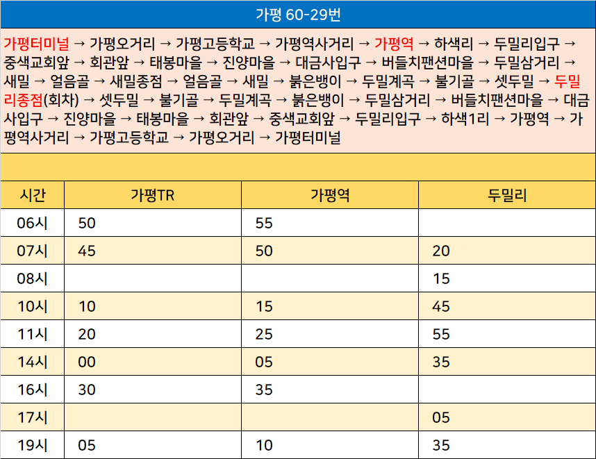 가평 60-29번: 가평터미널 → 가평오거리 → 가평고등학교 → 가평역사거리 → 가평역 → 하색리 → 두밀리입구 → 중색교회앞 → 회관앞 → 태봉마을 → 진양마을 → 대금사입구 → 버들치팬션마을 → 두밀삼거리 → 새밀 → 얼음골 → 새밀종점 → 얼음골 → 새밀 → 붉은뱅이 → 두밀계곡 → 불기골 → 셋두밀 → 두밀리종점(회차) → 셋두밀 → 불기골 → 두밀계곡 → 붉은뱅이 → 두밀삼거리 → 버들치팬션마을 → 대금사입구 → 진양마을 → 태봉마을 → 회관앞 → 중색교회앞 → 두밀리입구 → 하색1리 → 가평역 → 가평역사거리 → 가평고등학교 → 가평오거리 → 가평터미널