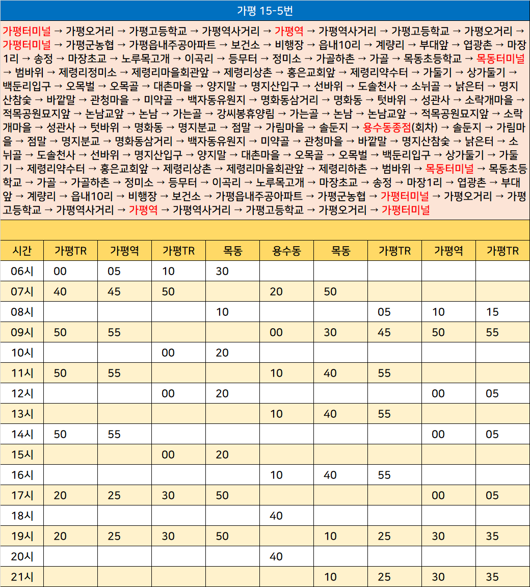 가평 15-5번: 가평터미널 → 가평오거리 → 가평고등학교 → 가평역사거리 → 가평역 → 가평역사거리 → 가평고등학교 → 가평오거리 → 가평터미널 → 가평군농협 → 가평읍내주공아파트 → 보건소 → 비행장 → 읍내10리 → 계량리 → 부대앞 → 엽광촌 → 마장1리 → 송정 → 마장초교 → 노루목고개 → 이곡리 → 등무터 → 정미소 → 가골하촌 → 가골 → 목동초등학교 → 목동터미널 → 범바위 → 제령리정미소 → 제령리마을회관앞 → 제령리상촌 → 홍은교회앞 → 제령리약수터 → 가둘기 → 상가둘기 → 백둔리입구 → 오목벌 → 오목골 → 대촌마을 → 양지말 → 명지산입구 → 선바위 → 도솔천사 → 소뉘골 → 낡은터 → 명지산참숯 → 바깥말 → 관청마을 → 미약골 → 백자동유원지 → 명화동삼거리 → 명화동 → 텃바위 → 성관사 → 소락개마을 → 적목공원묘지앞 → 논남교앞 → 논남 → 가는골 → 강씨봉휴양림 → 가는골 → 논남 → 논남교앞 → 적목공원묘지앞 → 소락개마을 → 성관사 → 텃바위 → 명화동 → 명지분교 → 점말 → 가림마을 → 솔둔지 → 용수동종점(회차) → 솔둔지 → 가림마을 → 점말 → 명지분교 → 명화동삼거리 → 백자동유원지 → 미약골 → 관청마을 → 바깥말 → 명지산참숯 → 낡은터 → 소뉘골 → 도솔천사 → 선바위 → 명지산입구 → 양지말 → 대촌마을 → 오목골 → 오목벌 → 백둔리입구 → 상가둘기 → 가둘기 → 제령리약수터 → 홍은교회앞 → 제령리상촌 → 제령리마을회관앞 → 제령리하촌 → 범바위 → 목동터미널 → 목동초등학교 → 가골 → 가골하촌 → 정미소 → 등무터 → 이곡리 → 노루목고개 → 마장초교 → 송정 → 마장1리 → 엽광촌 → 부대앞 → 계량리 → 읍내10리 → 비행장 → 보건소 → 가평읍내주공아파트 → 가평군농협 → 가평터미널 → 가평오거리 → 가평고등학교 → 가평역사거리 → 가평역 → 가평역사거리 → 가평고등학교 → 가평오거리 → 가평터미널