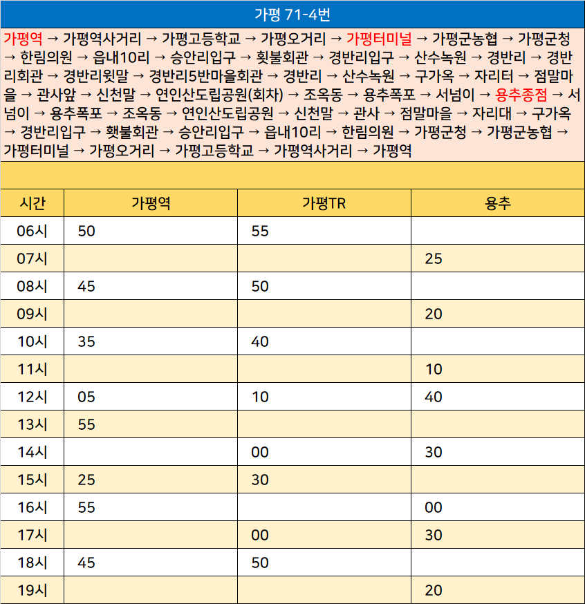 가평 71-4번: 가평역 → 가평역사거리 → 가평고등학교 → 가평오거리 → 가평터미널 → 가평군농협 → 가평군청 → 한림의원 → 읍내10리 → 승안리입구 → 횟불회관 → 경반리입구 → 산수녹원 → 경반리 → 경반리회관 → 경반리윗말 → 경반리5반마을회관 → 경반리 → 산수녹원 → 구가옥 → 자리터 → 점말마을 → 관사앞 → 신천말 → 연인산도립공원(회차) → 조옥동 → 용추폭포 → 서넘이 → 용추종점 → 서넘이 → 용추폭포 → 조옥동 → 연인산도립공원 → 신천말 → 관사 → 점말마을 → 자리대 → 구가옥 → 경반리입구 → 횃불회관 → 승안리입구 → 읍내10리 → 한림의원 → 가평군청 → 가평군농협 → 가평터미널 → 가평오거리 → 가평고등학교 → 가평역사거리 → 가평역