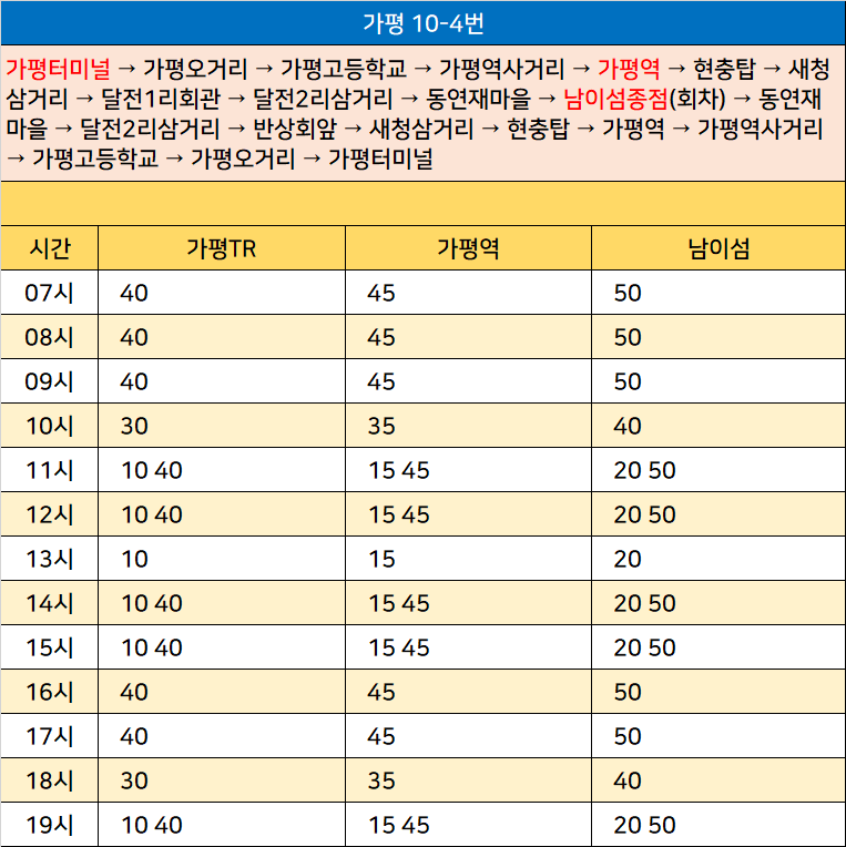 가평 10-4번: 가평터미널 → 가평오거리 → 가평고등학교 → 가평역사거리 → 가평역 → 현충탑 → 새청삼거리 → 달전1리회관 → 달전2리삼거리 → 동연재마을 → 남이섬종점(회차) → 동연재마을 → 달전2리삼거리 → 반상회앞 → 새청삼거리 → 현충탑 → 가평역 → 가평역사거리 → 가평고등학교 → 가평오거리 → 가평터미널