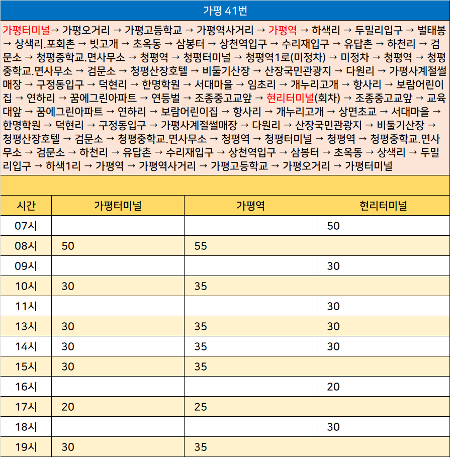 가평 41번: 가평터미널→ 가평오거리 → 가평고등학교 → 가평역사거리 → 가평역 → 하색리 → 두밀리입구 → 벌태봉 → 상색리.포회촌 → 빗고개 → 초옥동 → 삼봉터 → 상천역입구 → 수리재입구 → 유답촌 → 하천리 → 검문소 → 청평중학교.면사무소 → 청평역 → 청평터미널 → 청평역1로(미정차) → 미정차 → 청평역 → 청평중학교.면사무소 → 검문소 → 청평산장호텔 → 비둘기산장 → 산장국민관광지 → 다원리 → 가평사계절썰매장 → 구정동입구 → 덕현리 → 한명학원 → 서대마을 → 임초리 → 개누리고개 → 항사리 → 보람어린이집 → 연하리 → 꿈에그린아파트 → 연등벌 → 조종중고교앞 → 현리터미널(회차) → 조종중고교앞 → 교육대앞 → 꿈에그린아파트 → 연하리 → 보람어린이집 → 항사리 → 개누리고개 → 상면초교 → 서대마을 → 한명학원 → 덕현리 → 구정동입구 → 가평사계절썰매장 → 다원리 → 산장국민관광지 → 비둘기산장 → 청평산장호텔 → 검문소 → 청평중학교.면사무소 → 청평역 → 청평터미널 → 청평역 → 청평중학교.면사무소 → 검문소 → 하천리 → 유답촌 → 수리재입구 → 상천역입구 → 삼봉터 → 초옥동 → 상색리 → 두밀리입구 → 하색1리 → 가평역 → 가평역사거리 → 가평고등학교 → 가평오거리 → 가평터미널