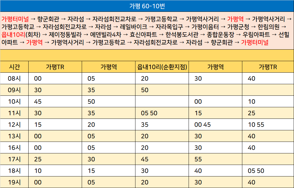 가평 60-10번: 가평터미널 → 향군회관 → 자라섬 → 자라섬회전교차로 → 가평고등학교 → 가평역사거리 → 가평역 → 가평역사거리 → 가평고등학교 → 자라섬회전교차로 → 자라섬 → 레일바이크 → 자라목입구 → 가평이음터 → 가평군청 → 한림의원 → 읍내10리(회차) → 제이정동빌라 → 에덴빌라4차 → 효신아파트 → 한석봉도서관 → 종합운동장 → 우림아파트 → 선힐아파트 → 가평역 → 가평역사거리 → 가평고등학교 → 자라섬회전교차로 → 자라섬 → 향군회관 → 가평터미널