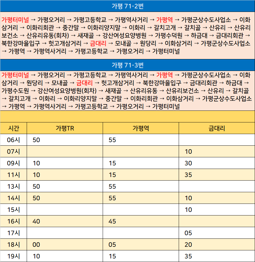가평 71-3번: 가평터미널 → 가평오거리 → 가평고등학교 → 가평역사거리 → 가평역 → 가평군상수도사업소 → 이화삼거리 → 원당리 → 모내골 → 금대리 → 헛고개삼거리 → 북한강마을입구 → 금대리회관 → 하금대 → 가평수도원 → 강산여성요양병원(회차) → 새재골 → 산유리유동 → 산유리보건소 → 산유리 → 갈치골 → 갈치고개 → 이화리 → 이화리양지말 → 중간말 → 이화리회관 → 이화삼거리 → 가평군상수도사업소 → 가평역 → 가평역사거리 → 가평고등학교 → 가평오거리 → 가평터미널