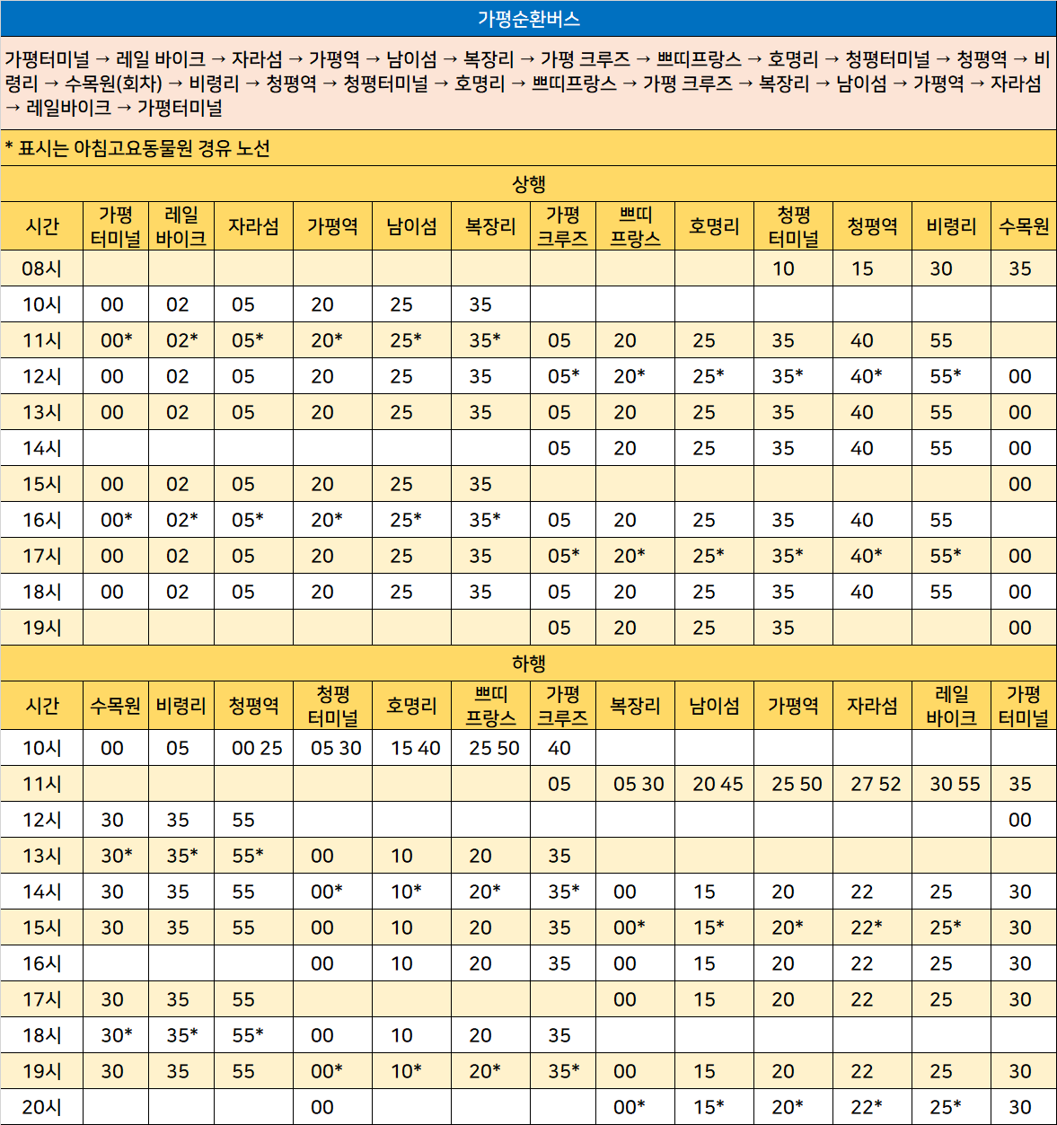 가평순환버스: 가평터미널 → 레일 바이크 → 자라섬 → 가평역 → 남이섬 → 복장리 → 가평 크루즈 → 쁘띠프랑스 → 호명리 → 청평터미널 → 청평역 → 비령리 → 수목원(회차) → 비령리 → 청평역 → 청평터미널 → 호명리 → 쁘띠프랑스 → 가평 크루즈 → 복장리 → 남이섬 → 가평역 → 자라섬 → 레일바이크 → 가평터미널