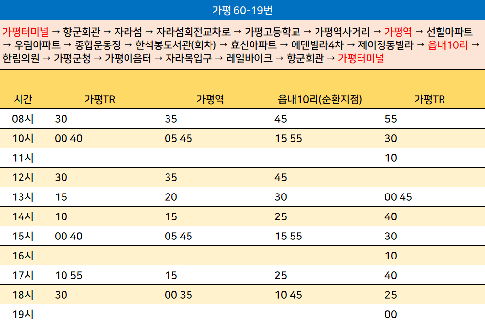 가평 60-19번: 가평터미널 → 향군회관 → 자라섬 → 자라섬회전교차로 → 가평고등학교 → 가평역사거리 → 가평역 → 선힐아파트 → 우림아파트 → 종합운동장 → 한석봉도서관(회차) → 효신아파트 → 에덴빌라4차 → 제이정동빌라 → 읍내10리 → 한림의원 → 가평군청 → 가평이음터 → 자라목입구 → 레일바이크 → 향군회관 → 가평터미널