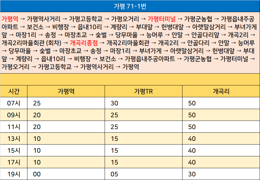 가평 71-1번: 가평역 → 가평역사거리 → 가평고등학교 → 가평오거리 → 가평터미널 → 가평군농협 → 가평읍내주공아파트 → 보건소 → 비행장 → 읍내10리 → 계량리 → 부대앞 → 헌병대앞 → 아랫말삼거리 → 부녀가게앞 → 마장1리 → 송정 → 마장초교 → 숯벌 → 당무마을 → 능머루 → 안말 → 안골다리앞 → 개곡2리 → 개곡2리마을회관 (회차) → 개곡리종점 → 개곡2리마을회관 → 개곡2리 → 안골다리 → 안말 → 능머루 → 당무마을 → 숯벌 → 마장초교 → 송정 → 마장1리 → 부녀가게 → 아랫말삼거리 → 헌병대앞 → 부대앞 → 계량리 → 읍내10리 → 비행장 → 보건소 → 가평읍내주공아파트 → 가평군농협 → 가평터미널 → 가평오거리 → 가평고등학교 → 가평역사거리 → 가평역