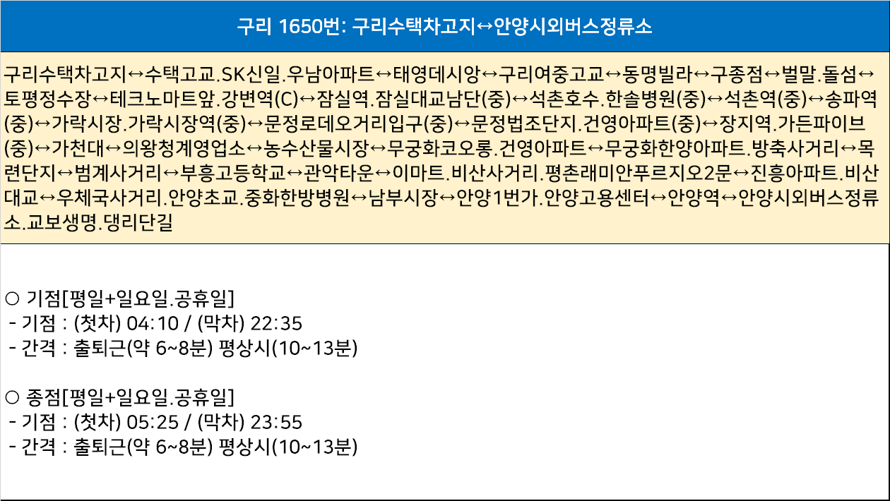 구리 1650번: 구리수택차고지↔안양시외버스정류소