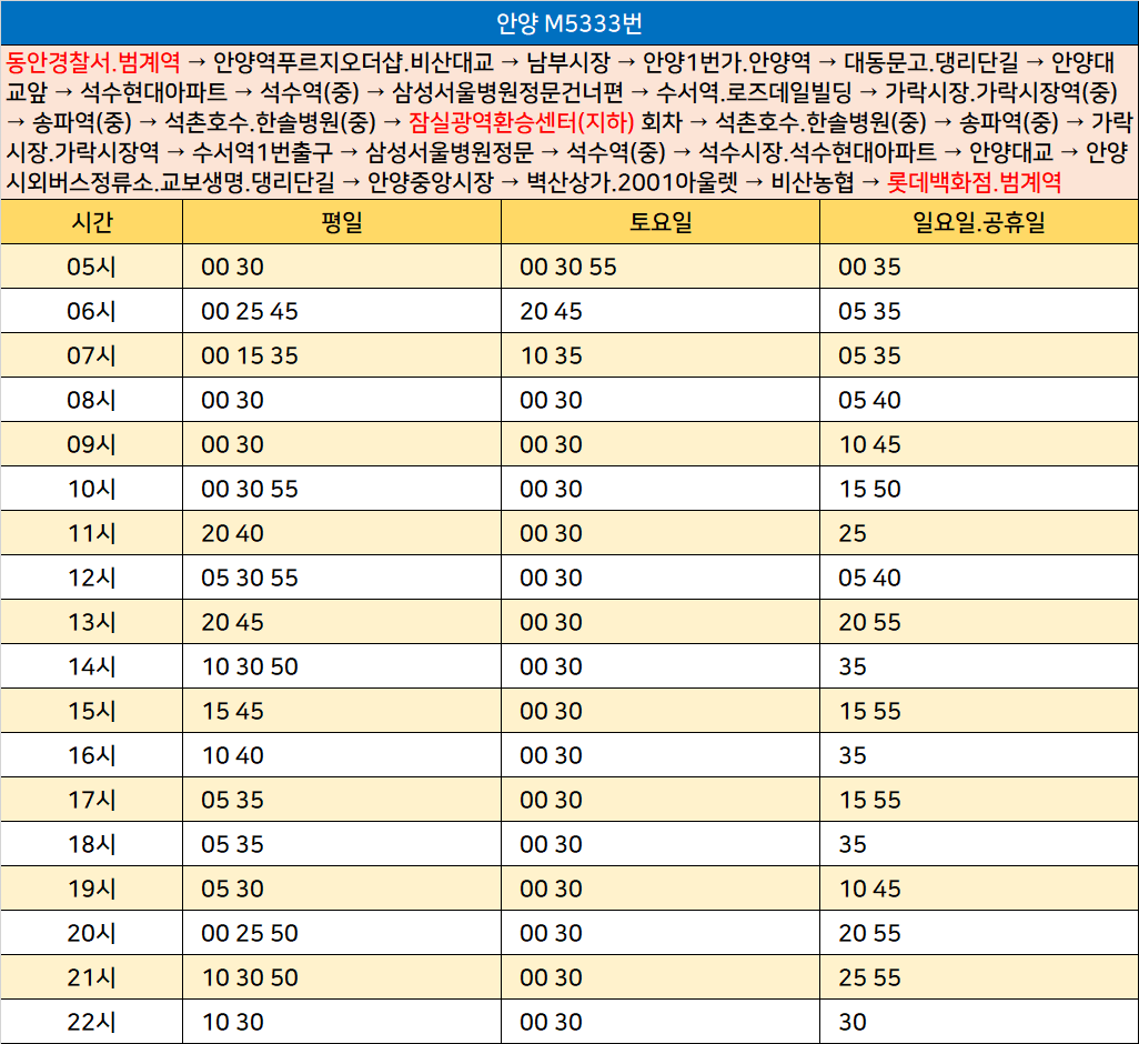 안양 M5333번: 동안경찰서.범계역 → 안양역푸르지오더샵.비산대교 → 남부시장 → 안양1번가.안양역 → 대동문고.댕리단길 → 안양대교앞 → 석수현대아파트 → 석수역(중) → 삼성서울병원정문건너편 → 수서역.로즈데일빌딩 → 가락시장.가락시장역(중) → 송파역(중) → 석촌호수.한솔병원(중) → 잠실광역환승센터(지하) 회차 → 석촌호수.한솔병원(중) → 송파역(중) → 가락시장.가락시장역 → 수서역1번출구 → 삼성서울병원정문 → 석수역(중) → 석수시장.석수현대아파트 → 안양대교 → 안양시외버스정류소.교보생명.댕리단길 → 안양중앙시장 → 벽산상가.2001아울렛 → 비산농협 → 롯데백화점.범계역