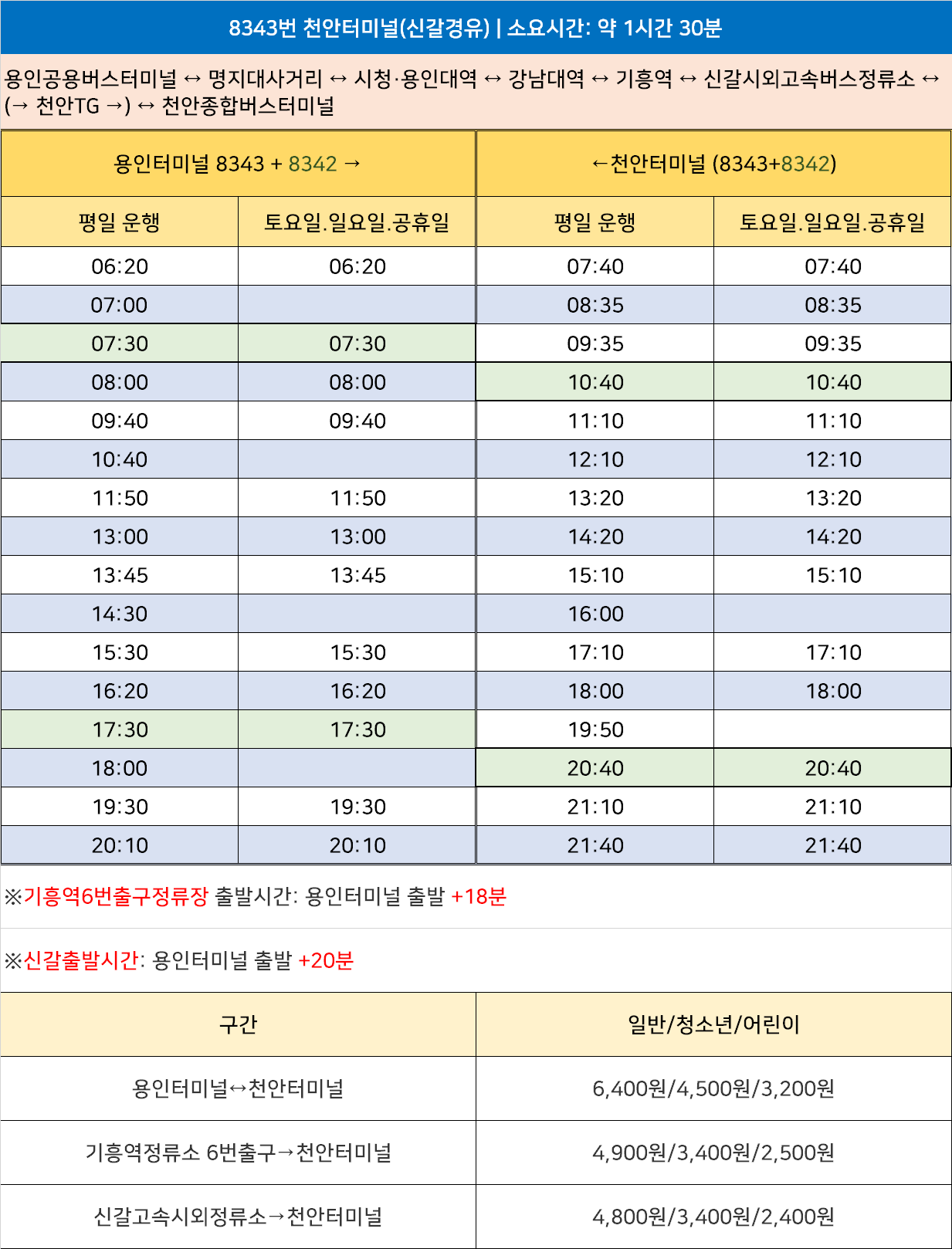 용인 8343번(신갈경유): 전체 소요 시간: 약 1시간 30분: 용인공용버스터미널 ↔ 천안종합버스터미널