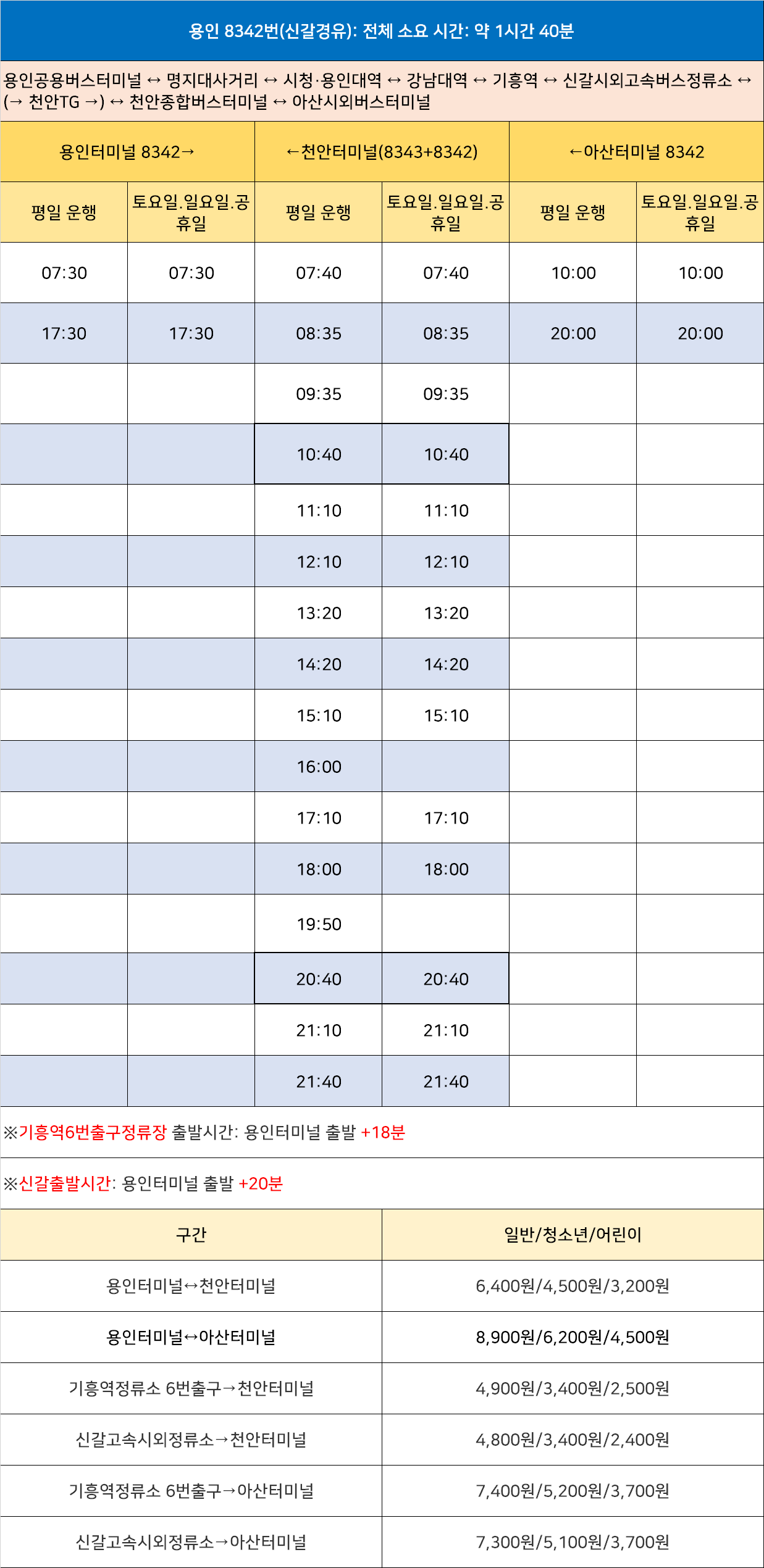 용인 8342번(신갈경유): 전체 소요 시간: 약 1시간 40분: 용인공용버스터미널 ↔ 아산시외버스터미널