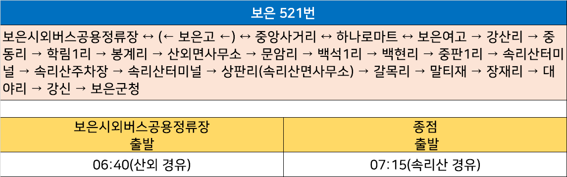 보은 521번: 보은시외버스공용정류장 ↔ (← 보은고 ←) ↔ 중앙사거리 ↔ 하나로마트 ↔ 보은여고 → 강산리 → 중동리 → 학림1리 → 봉계리 → 산외면사무소 → 문암리 → 백석1리 → 백현리 → 중판1리 → 속리산터미널 → 속리산주차장 → 속리산터미널 → 상판리(속리산면사무소) → 갈목리 → 말티재 → 장재리 → 대야리 → 강신 → 보은군청