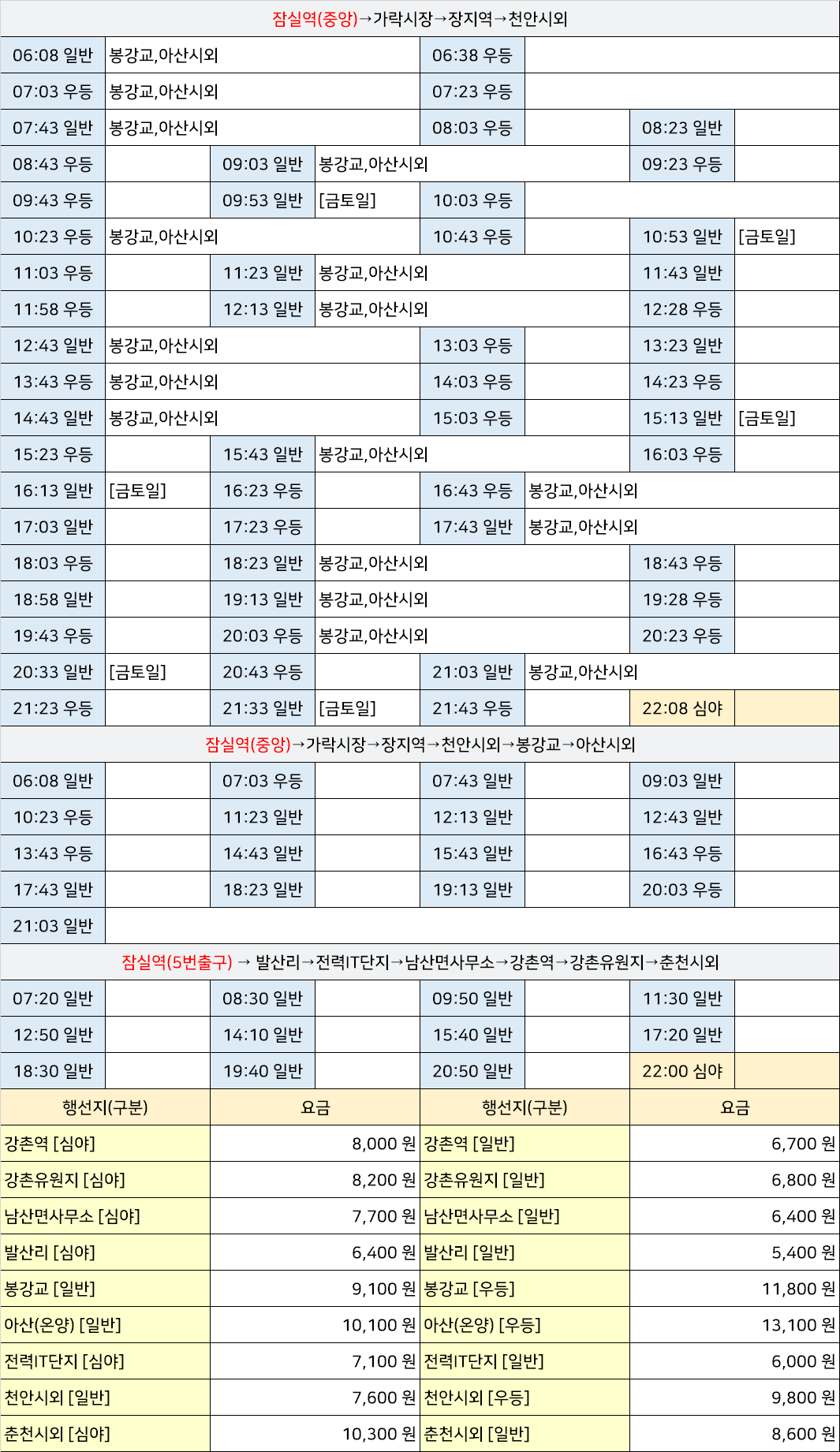 잠실역시외고속버스터미널 잠실역5번출구정류장 잠실역중앙정류장 잠실역5번출구정류소 잠실역중앙정류소 → "발산리→전력IT단지→남산면사무소→강촌역→강촌유원지→춘천시외,잠실→가락시장→장지역→천안시외→봉강교→아산시외".