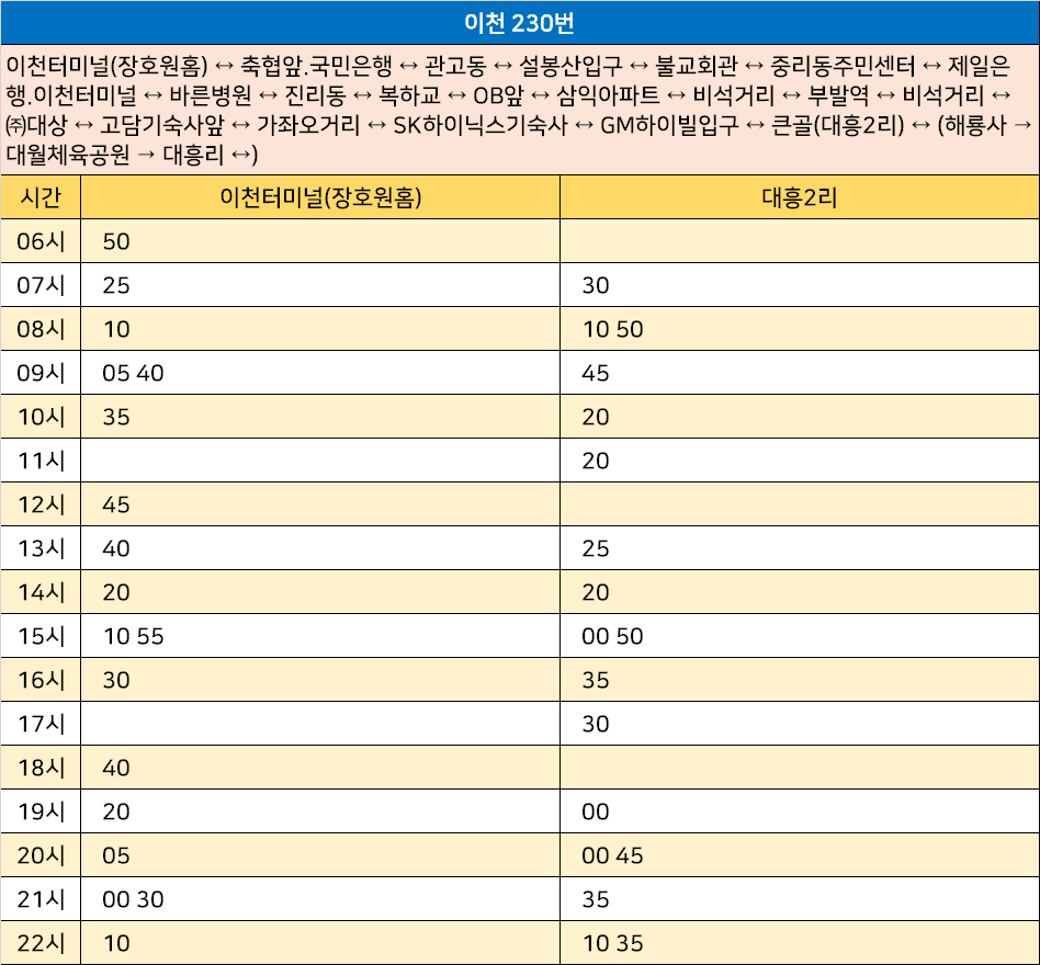 이천 230번: 이천터미널(장호원홈) ↔ 축협앞.국민은행 ↔ 관고동 ↔ 설봉산입구 ↔ 불교회관 ↔ 중리동주민센터 ↔ 제일은행.이천터미널 ↔ 바른병원 ↔ 진리동 ↔ 복하교 ↔ OB앞 ↔ 삼익아파트 ↔ 비석거리 ↔ 부발역 ↔ 비석거리 ↔ ㈜대상 ↔ 고담기숙사앞 ↔ 가좌오거리 ↔ SK하이닉스기숙사 ↔ GM하이빌입구 ↔ 큰골(대흥2리) ↔ (해룡사 → 대월체육공원 → 대흥리 ↔)