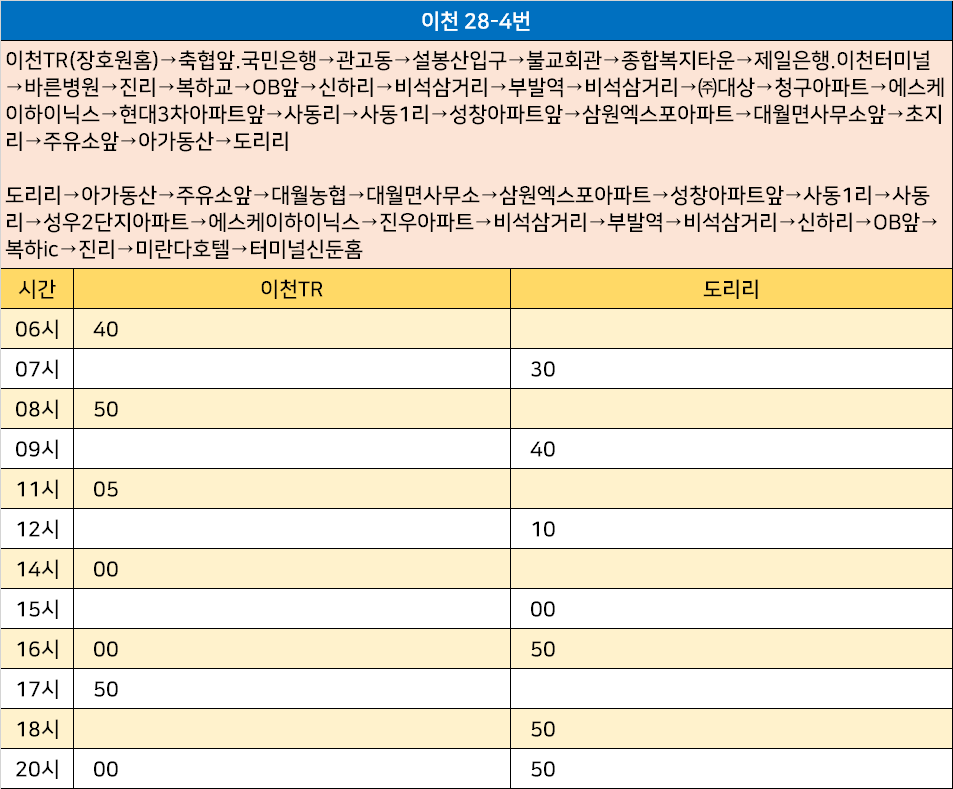이천 28-4번: 이천TR(장호원홈)→축협앞.국민은행→관고동→설봉산입구→불교회관→종합복지타운→제일은행.이천터미널→바른병원→진리→복하교→OB앞→신하리→비석삼거리→부발역→비석삼거리→㈜대상→청구아파트→에스케이하이닉스→현대3차아파트앞→사동리→사동1리→성창아파트앞→삼원엑스포아파트→대월면사무소앞→초지리→주유소앞→아가동산→도리리 / 도리리→아가동산→주유소앞→대월농협→대월면사무소→삼원엑스포아파트→성창아파트앞→사동1리→사동리→성우2단지아파트→에스케이하이닉스→진우아파트→비석삼거리→부발역→비석삼거리→신하리→OB앞→복하ic→진리→미란다호텔→터미널신둔홈