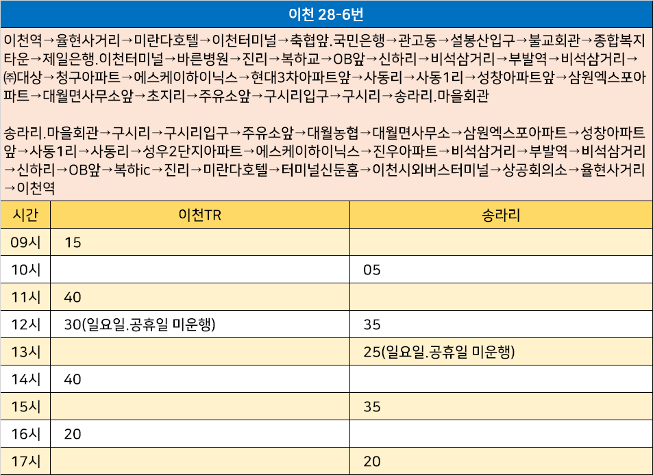 이천 28-6번: 이천역→율현사거리→미란다호텔→이천터미널→축협앞.국민은행→관고동→설봉산입구→불교회관→종합복지타운→제일은행.이천터미널→바른병원→진리→복하교→OB앞→신하리→비석삼거리→부발역→비석삼거리→㈜대상→청구아파트→에스케이하이닉스→현대3차아파트앞→사동리→사동1리→성창아파트앞→삼원엑스포아파트→대월면사무소앞→초지리→주유소앞→구시리입구→구시리→송라리.마을회관 / 송라리.마을회관→구시리→구시리입구→주유소앞→대월농협→대월면사무소→삼원엑스포아파트→성창아파트앞→사동1리→사동리→성우2단지아파트→에스케이하이닉스→진우아파트→비석삼거리→부발역→비석삼거리→신하리→OB앞→복하ic→진리→미란다호텔→터미널신둔홈→이천시외버스터미널→상공회의소→율현사거리→이천역
