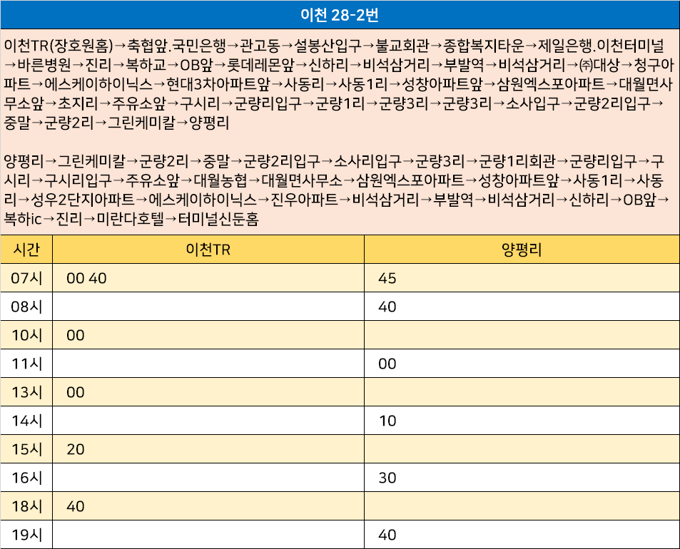 이천 28-2번: 이천TR(장호원홈)→축협앞.국민은행→관고동→설봉산입구→불교회관→종합복지타운→제일은행.이천터미널→바른병원→진리→복하교→OB앞→롯데레몬앞→신하리→비석삼거리→부발역→비석삼거리→㈜대상→청구아파트→에스케이하이닉스→현대3차아파트앞→사동리→사동1리→성창아파트앞→삼원엑스포아파트→대월면사무소앞→초지리→주유소앞→구시리→군량리입구→군량1리→군량3리→군량3리→소사입구→군량2리입구→중말→군량2리→그린케미칼→양평리 / 양평리→그린케미칼→군량2리→중말→군량2리입구→소사리입구→군량3리→군량1리회관→군량리입구→구시리→구시리입구→주유소앞→대월농협→대월면사무소→삼원엑스포아파트→성창아파트앞→사동1리→사동리→성우2단지아파트→에스케이하이닉스→진우아파트→비석삼거리→부발역→비석삼거리→신하리→OB앞→복하ic→진리→미란다호텔→터미널신둔홈