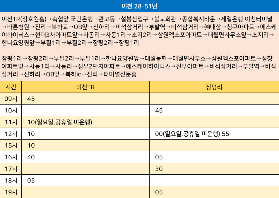 이천 28-51번: 이천TR(장호원홈)→축협앞.국민은행→관고동→설봉산입구→불교회관→종합복지타운→제일은행.이천터미널→바른병원→진리→복하교→OB앞→신하리→비석삼거리→부발역→비석삼거리→㈜대상→청구아파트→에스케이하이닉스→현대3차아파트앞→사동리→사동1리→초지2리→삼원엑스포아파트→대월면사무소앞→초지리→한나요양원앞→부필1리→부필2리→장평2리→장평1리 / 장평1리→장평2리→부필2리→부필1리→한나요양원앞→대월농협→대월면사무소→삼원엑스포아파트→성창아파트앞→사동1리→사동리→성우2단지아파트→에스케이하이닉스→진우아파트→비석삼거리→부발역→비석삼거리→신하리→OB앞→복하ic→진리→터미널신둔홈
