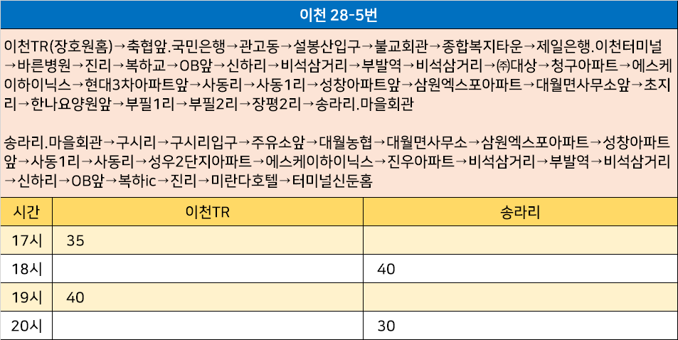 이천 28-5번: 이천TR(장호원홈)→축협앞.국민은행→관고동→설봉산입구→불교회관→종합복지타운→제일은행.이천터미널→바른병원→진리→복하교→OB앞→신하리→비석삼거리→부발역→비석삼거리→㈜대상→청구아파트→에스케이하이닉스→현대3차아파트앞→사동리→사동1리→성창아파트앞→삼원엑스포아파트→대월면사무소앞→초지리→한나요양원앞→부필1리→부필2리→장평2리→송라리.마을회관 / 송라리.마을회관→구시리→구시리입구→주유소앞→대월농협→대월면사무소→삼원엑스포아파트→성창아파트앞→사동1리→사동리→성우2단지아파트→에스케이하이닉스→진우아파트→비석삼거리→부발역→비석삼거리→신하리→OB앞→복하ic→진리→미란다호텔→터미널신둔홈