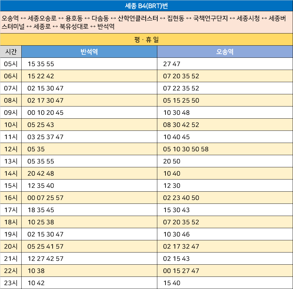 세종 B4(BRT)번: 오송역 ↔ 세종오송로 ↔ 용호동 ↔ 다솜동 ↔ 산학연클러스터 ↔ 집현동 ↔ 국책연구단지 ↔ 세종시청 ↔ 세종버스터미널 ↔ 세종로 ↔ 북유성대로 ↔ 반석역