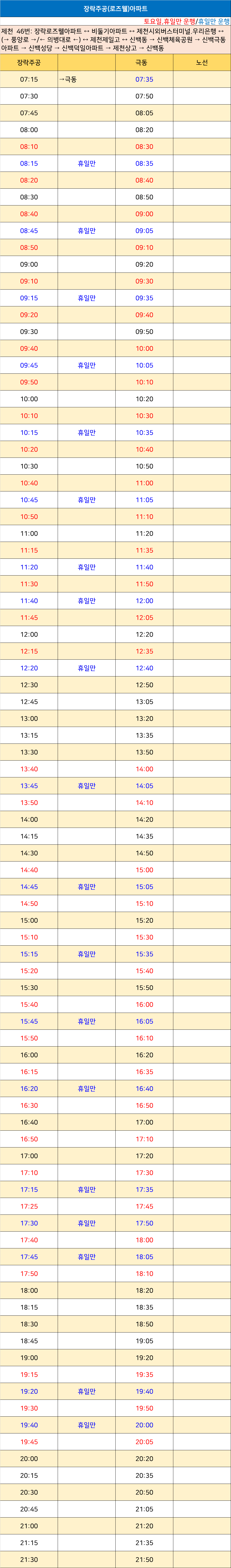 제천 46번: 장락로즈웰아파트 ↔ 비둘기아파트 ↔ 제천시외버스터미널.우리은행 ↔ (→ 풍양로 →/← 의병대로 ←) ↔ 제천제일고 ↔ 신백동 → 신백체육공원 → 신백극동아파트 → 신백성당 → 신백덕일아파트 → 제천상고 → 신백동