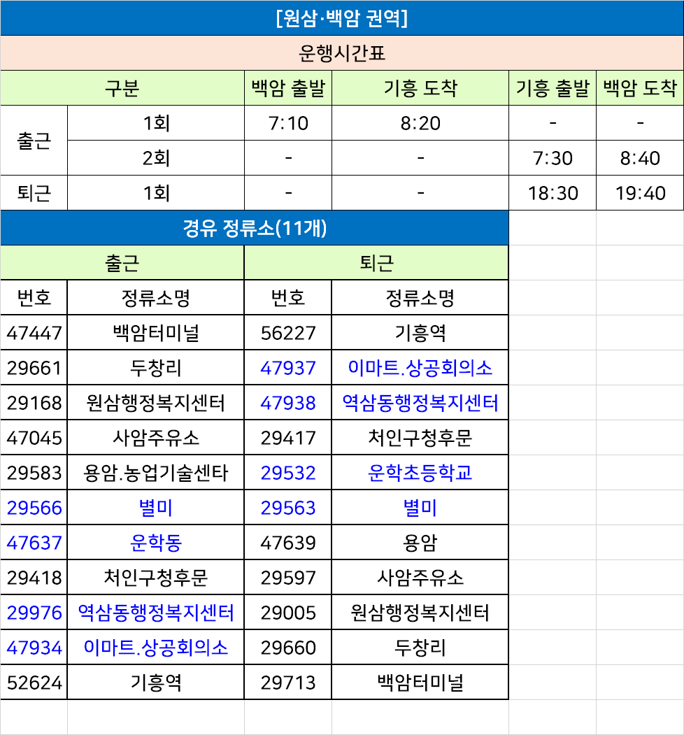 용인 원삼. 백암 권역 Y1202버스 시간표: 기흥역,이마트.상송회의소,역삼동행정복지센터,처인구청후문,운학초등학교, 별미, 용암 사암주유소,원삼행정복지센터, 두창리, 백암터미널