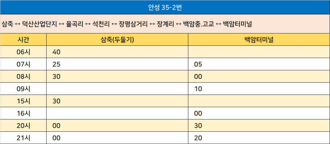 안성 35-2번: 삼죽 ↔ 덕산산업단지 ↔ 율곡리 ↔ 석천리 ↔ 장평삼거리 ↔ 장계리 ↔ 백암중.고교 ↔ 백암터미널