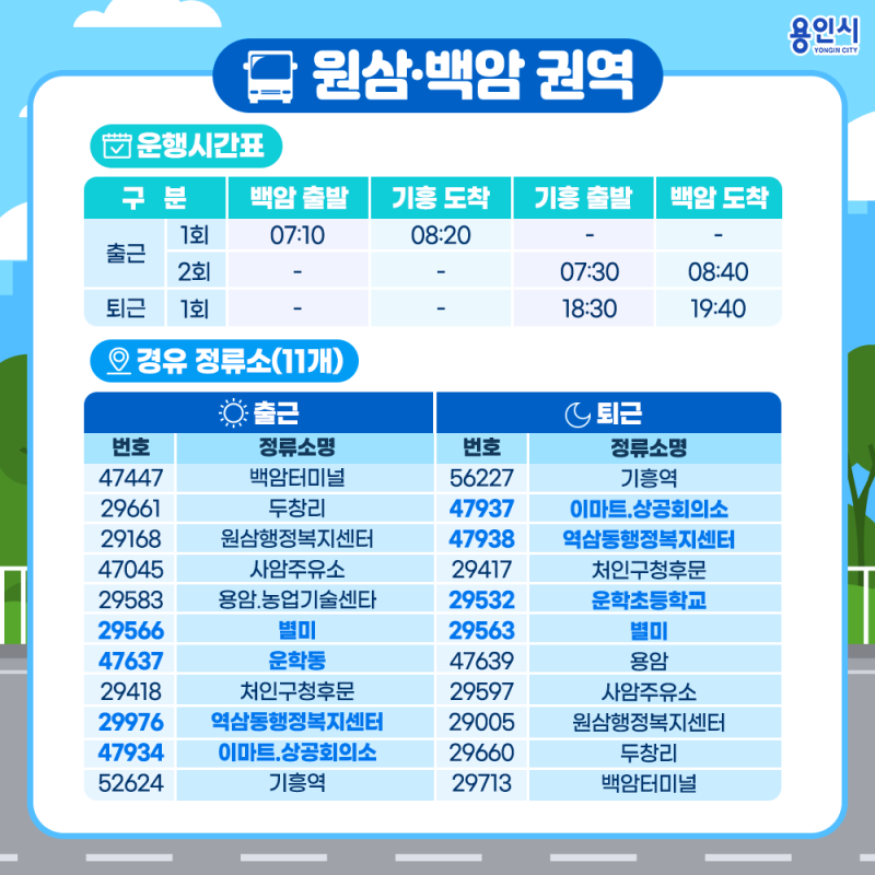 용인 16번: 용인터미널 ↔ 포브스병원 ↔ 용인예술과학대학교(구.송담대) ↔ 운학초교 ↔ 와우정사 ↔ 곱등고개 ↔ 내동연꽃마을 ↔ 용인농촌테마파크 ↔ 법륜사 ↔ 원삼면행정복지센터 ↔ 원삼초교 ↔ 두창리 ↔ 용운사입구 ↔ 근창리 ↔ 백암초.중.고 ↔ 백암터미널