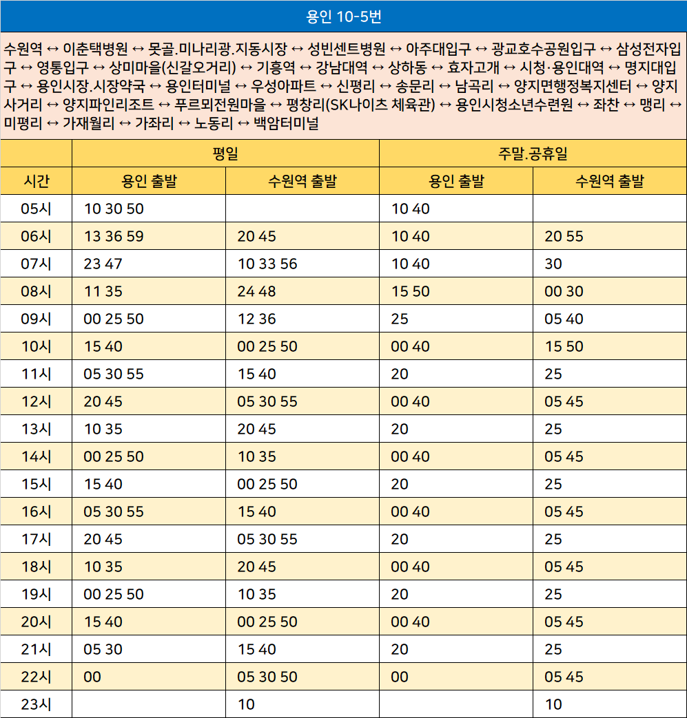 용인 10-5번: 용인터미널 ↔ 처인구청후문 ↔ 명지대입구 ↔ 용인시청.용인대입구 ↔ 삼가역 ↔ 효자고개 ↔ 지곡동(써니밸리입구) ↔ 한국민속촌 ↔ 한보라마을입구 ↔ 나산초등학교 ↔ 통미마을 ↔ 상갈역 ↔ 금화마을 ↔ 경기도박물관 ↔ 상미마을(신갈오거리) ↔ 영통입구 ↔ 광교호수공원입구 ↔ 아주대입구 ↔ 동수원사거리 ↔ 못골.미나리광.지동시장 ↔ 영동시장 ↔ 수원세무서 ↔ 수원역