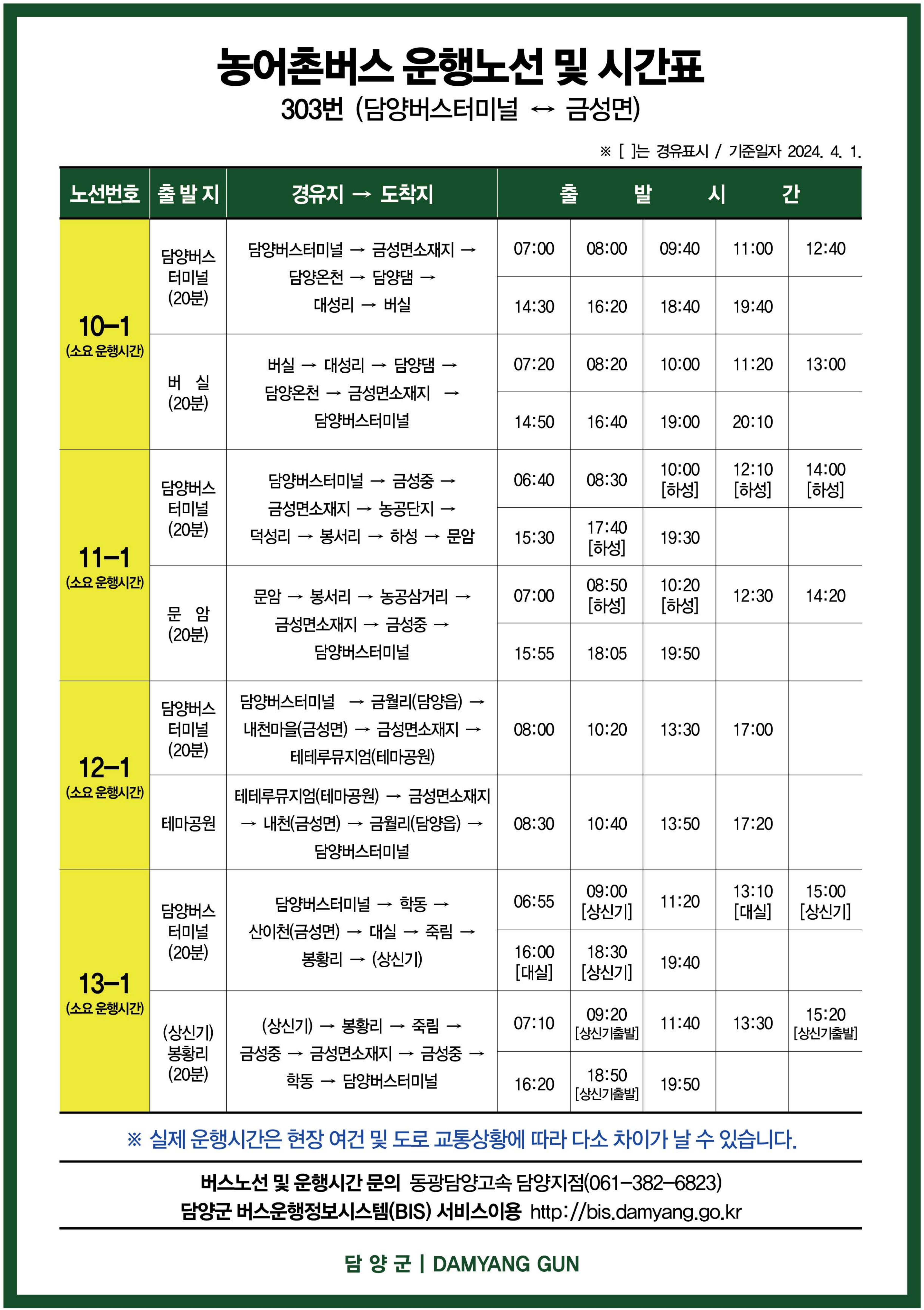 담양군 13-1번: 담양버스터미널 → 학동 → 산이천(금성면) → 대실 → 죽림 → 봉황리 → (상신기) / (상신기) → 봉황리 → 죽림 → 금성중 → 금성면소재지 → 금성중 → 학동 → 담양버스터미널