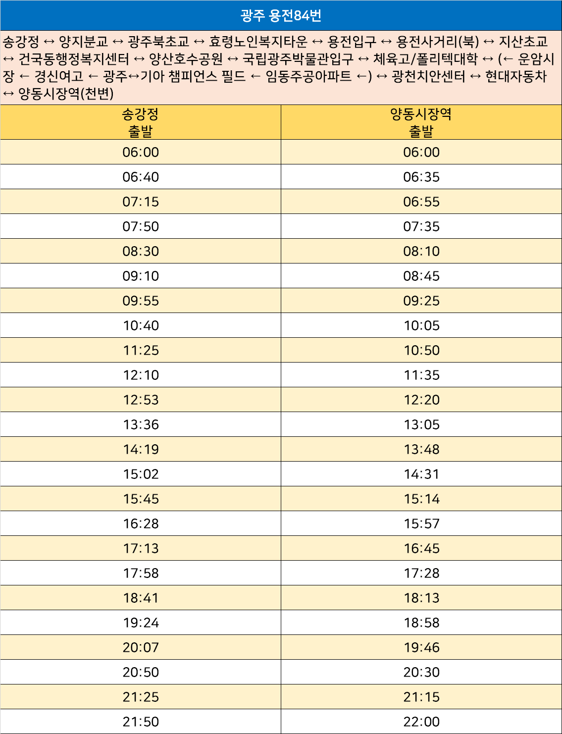 광주 용전84번: 송강정 ↔ 양지분교 ↔ 광주북초교 ↔ 효령노인복지타운 ↔ 용전입구 ↔ 용전사거리(북) ↔ 지산초교 ↔ 건국동행정복지센터 ↔ 양산호수공원 ↔ 국립광주박물관입구 ↔ 체육고/폴리텍대학 ↔ (← 운암시장 ← 경신여고 ← 광주↔기아 챔피언스 필드 ← 임동주공아파트 ←) ↔ 광천치안센터 ↔ 현대자동차 ↔ 양동시장역(천변)