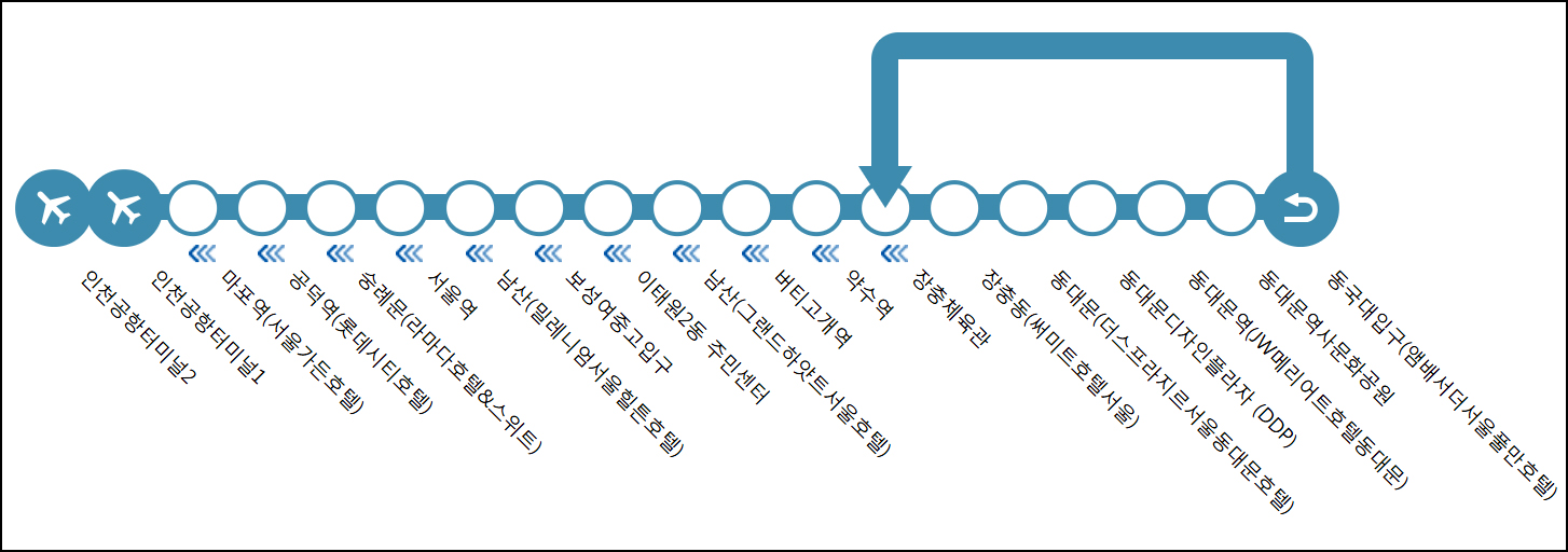 인천공항2터미널 → 인천공항1터미널 → 마포역(서울가든호텔) → 공덕역(롯데시티호텔) → 숭례문(라마다&스위트호텔) → 서울역 → 남산(밀레니엄서울힐튼호텔) → 보성여중고입구 → 이태원2동 주민센터 → 남산(그랜드하얏트서울호텔) → 버티고개역 → 약수역 → 장충체육관앞 → 장충동(써미트호텔서울) → 동대문(더스프라지르서울동대문) → 동대문디자인플라자(DDP) → 동대문역(JW메리어트호텔동대문) → 동대문역사문화공원 → 동국대입구(앰배서더서울풀만호텔)