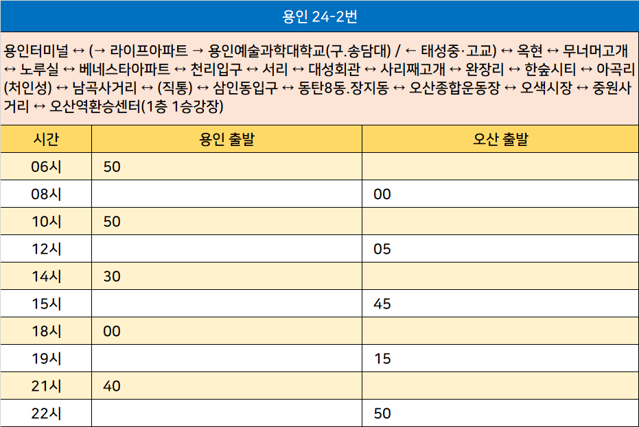 용인 24-2번: 용인터미널 ↔ (→ 라이프아파트 → 용인예술과학대학교(구.송담대) / ← 태성중·고교) ↔ 옥현 ↔ 무너머고개 ↔ 노루실 ↔ 베네스타아파트 ↔ 천리입구 ↔ 서리 ↔ 대성회관 ↔ 사리째고개 ↔ 완장리 ↔ 한숲시티 ↔ 아곡리(처인성) ↔ 남곡사거리 ↔ (직통) ↔ 삼인동입구 ↔ 동탄8동.장지동 ↔ 오산종합운동장 ↔ 오색시장 ↔ 중원사거리 ↔ 오산역환승센터(1층 1승강장)