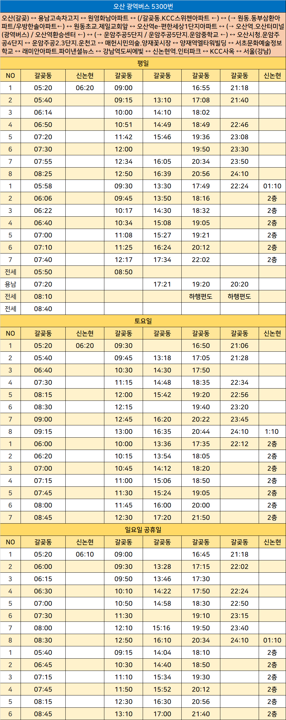 오산 광역버스 5300번: 오산(갈곶) ↔ 용남고속차고지 ↔ 원영화남아파트 ↔ (/갈곶동.KCC스위첸아파트 ←) ↔ (→ 원동.동부삼환아파트/우방한솔아파트←) ↔ 원동초교.제일교회앞 ↔ 오산역e-편한세상1단지아파트 ↔ (→ 오산역.오산터미널(광역버스) / 오산역환승센터 ←) ↔ (→ 운암주공5단지 / 운암주공5단지.운암중학교 ←) ↔ 오산시청.운암주공4단지 ↔ 운암주공2.3단지.운천고 ↔ 매헌시민의숲.양재꽃시장 ↔ 양재역엘타워빌딩 ↔ 서초문화예술정보학교 ↔ 래미안아파트.파이낸셜뉴스 ↔ 강남역도씨에빛 ↔ 신논현역.인터파크 ↔ KCC사옥 ↔ 서울(강남)