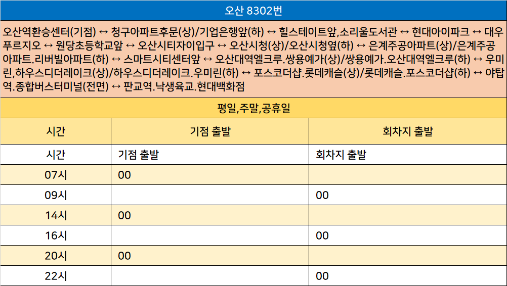 오산 8302번: 오산역환승센터 ↔ 청구아파트후문(상)/기업은행앞(하) ↔ 힐스테이트앞,소리울도서관 ↔ 현대아이파크 ↔ 대우푸르지오 ↔ 원당초등학교앞 ↔ 오산시티자이입구 ↔ 오산시청(상)/오산시청옆(하) ↔ 은계주공아파트(상)/은계주공아파트.리버빌아파트(하) ↔ 스마트시티센터앞 ↔ 오산대역엘크루.쌍용예가(상)/쌍용예가.오산대역엘크루(하) ↔ 우미린,하우스디더레이크(상)/하우스디더레이크.우미린(하) ↔ 포스코더샵.롯데캐슬(상)/롯데캐슬.포스코더샵(하) ↔ 야탑역.종합버스터미널(전면) ↔ 판교역.낙생육교.현대백화점