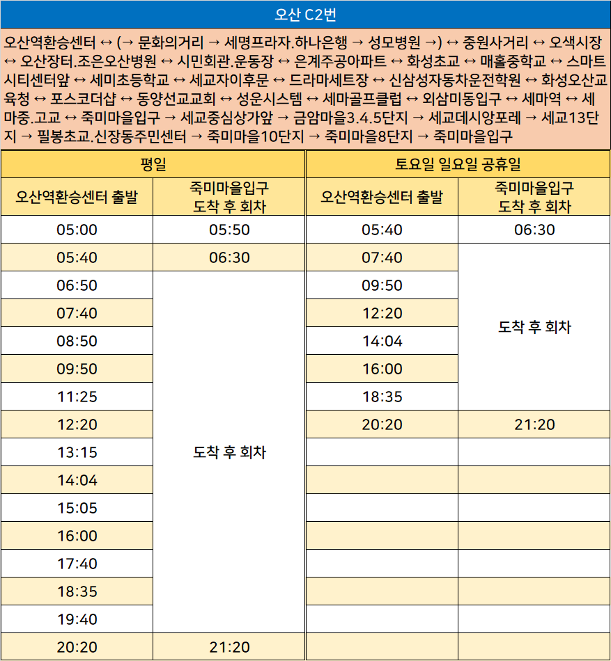 오산 C2번: 오산역환승센터 ↔ (→ 문화의거리 → 세명프라자.하나은행 → 성모병원 →) ↔ 중원사거리 ↔ 오색시장 ↔ 오산장터.조은오산병원 ↔ 시민회관.운동장 ↔ 은계주공아파트 ↔ 화성초교 ↔ 매홀중학교 ↔ 스마트시티센터앞 ↔ 세미초등학교 ↔ 세교자이후문 ↔ 드라마세트장 ↔ 신삼성자동차운전학원 ↔ 화성오산교육청 ↔ 포스코더샵 ↔ 동양선교교회 ↔ 성운시스템 ↔ 세마골프클럽 ↔ 외삼미동입구 ↔ 세마역 ↔ 세마중.고교 ↔ 죽미마을입구 → 세교중심상가앞 → 금암마을3.4.5단지 → 세교데시앙포레 → 세교13단지 → 필봉초교.신장동주민센터 → 죽미마을10단지 → 죽미마을8단지 → 죽미마을입구