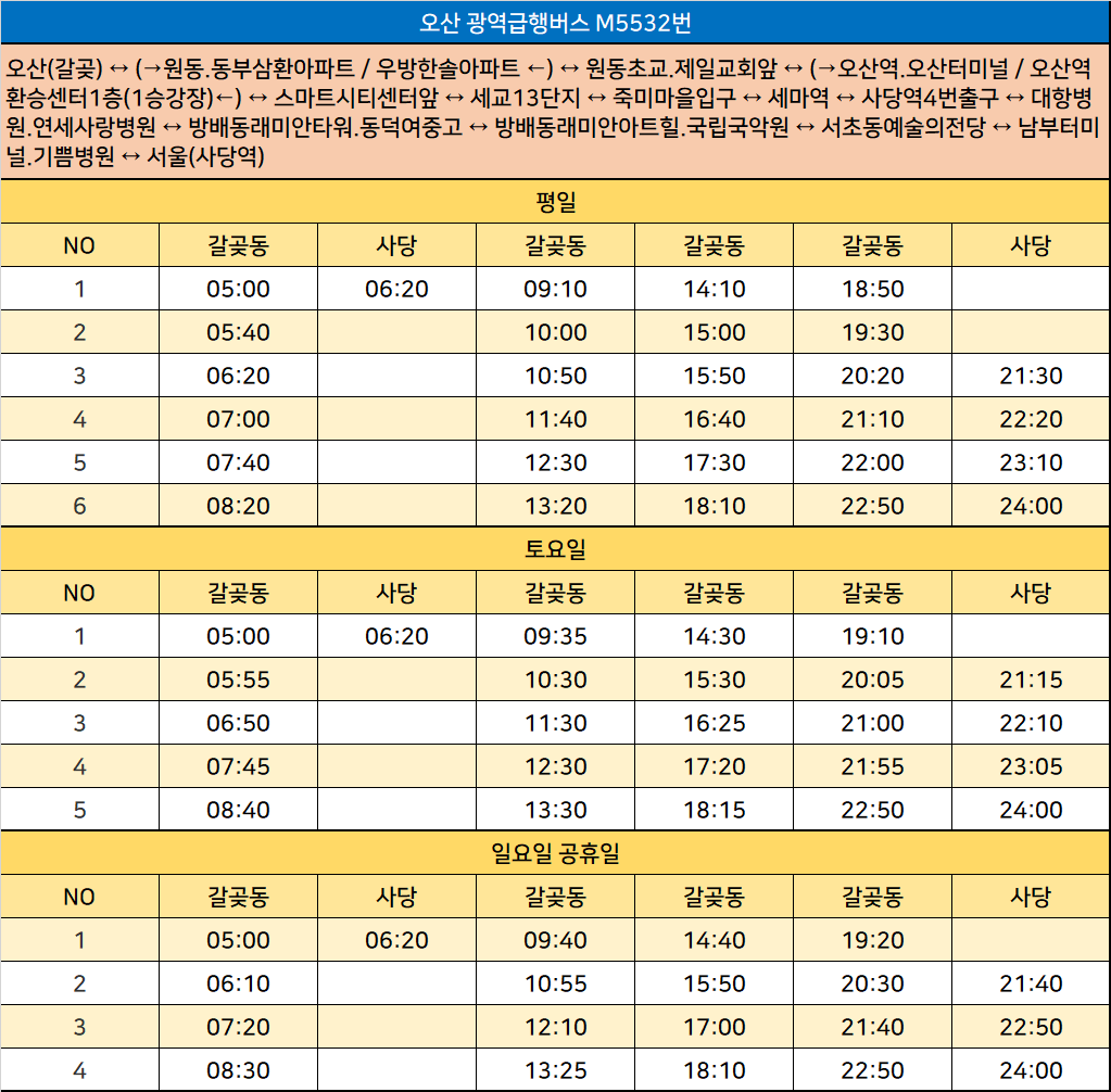 오산 광역급행버스 M5532번: 오산(갈곶) ↔ (→원동.동부삼환아파트 / 우방한솔아파트 ←) ↔ 원동초교.제일교회앞 ↔ (→오산역.오산터미널 / 오산역환승센터1층(1승강장)←) ↔ 스마트시티센터앞 ↔ 세교13단지 ↔ 죽미마을입구 ↔ 세마역 ↔ 사당역4번출구 ↔ 대항병원.연세사랑병원 ↔ 방배동래미안타워.동덕여중고 ↔ 방배동래미안아트힐.국립국악원 ↔ 서초동예술의전당 ↔ 남부터미널.기쁨병원 ↔ 서울(사당역)