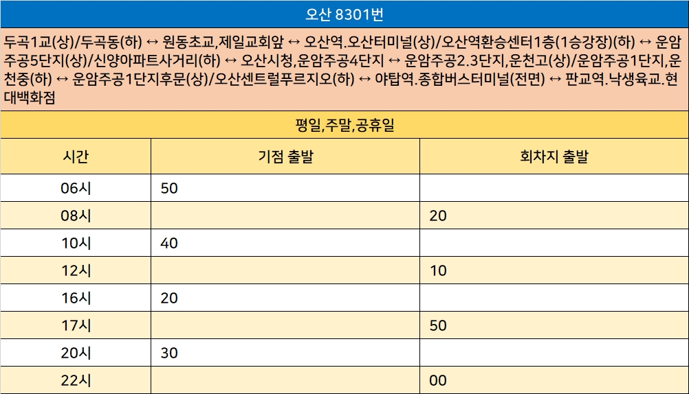오산 8301번: 두곡1교(상)/두곡동(하) ↔ 원동초교,제일교회앞 ↔ 오산역.오산터미널(상)/오산역환승센터1층(1승강장)(하) ↔ 운암주공5단지(상)/신양아파트사거리(하) ↔ 오산시청,운암주공4단지 ↔ 운암주공2.3단지,운천고(상)/운암주공1단지,운천중(하) ↔ 운암주공1단지후문(상)/오산센트럴푸르지오(하) ↔ 야탑역.종합버스터미널(전면) ↔ 판교역.낙생육교.현대백화점