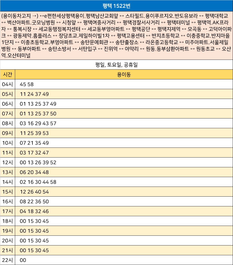 평택 1522번: (용이동차고지 →) ↔e편한세상평택용이.평택남산교회앞 ↔ 스타필드.용이푸르지오.반도유보라 ↔ 평택대학교 ↔ 벽산아파트.굿모닝병원 ↔ 시청앞 ↔ 평택여중사거리 ↔ 평택경찰서사거리 ↔ 평택터미널 ↔ 평택역.AK프라자 ↔ 통복시장 ↔ 세교동행정복지센터 ↔ 세교동부영아파트 ↔ 평택공단 ↔ 평택지제역 ↔ 모곡동 ↔ 고덕아이파크 ↔ 광동제약.홈플러스 ↔ 장당초교.제일하이빌1차 ↔ 평택고용센터 ↔ 반지초등학교 ↔ 이충중학교.반지마을1단지 ↔ 이충초등학교.부영아파트 ↔ 송탄문예회관 ↔ 송탄출장소 ↔ 라온중고등학교 ↔ 미주아파트.서울제일병원 ↔ 동부아파트 ↔ 송탄소방서 ↔ 서탄입구 ↔ 진위역 ↔ 야막리 ↔ 원동.동부삼환아파트 ↔ 원동초교 ↔ 오산역.오산터미널