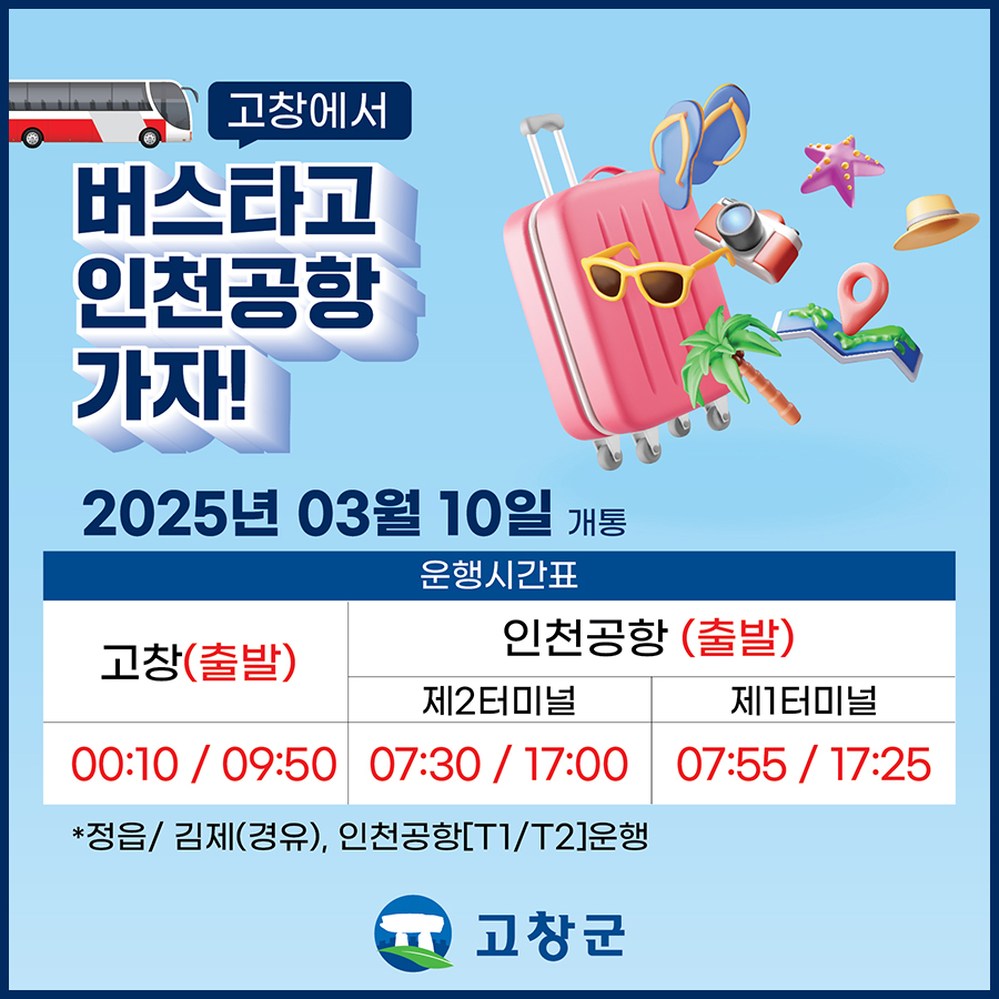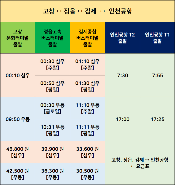 고창문화터미널 ↔ 정읍고속버스터미널 ↔ 김제종합버스터미널 ↔ 인천공항 T1 ↔ 인천공항 T2