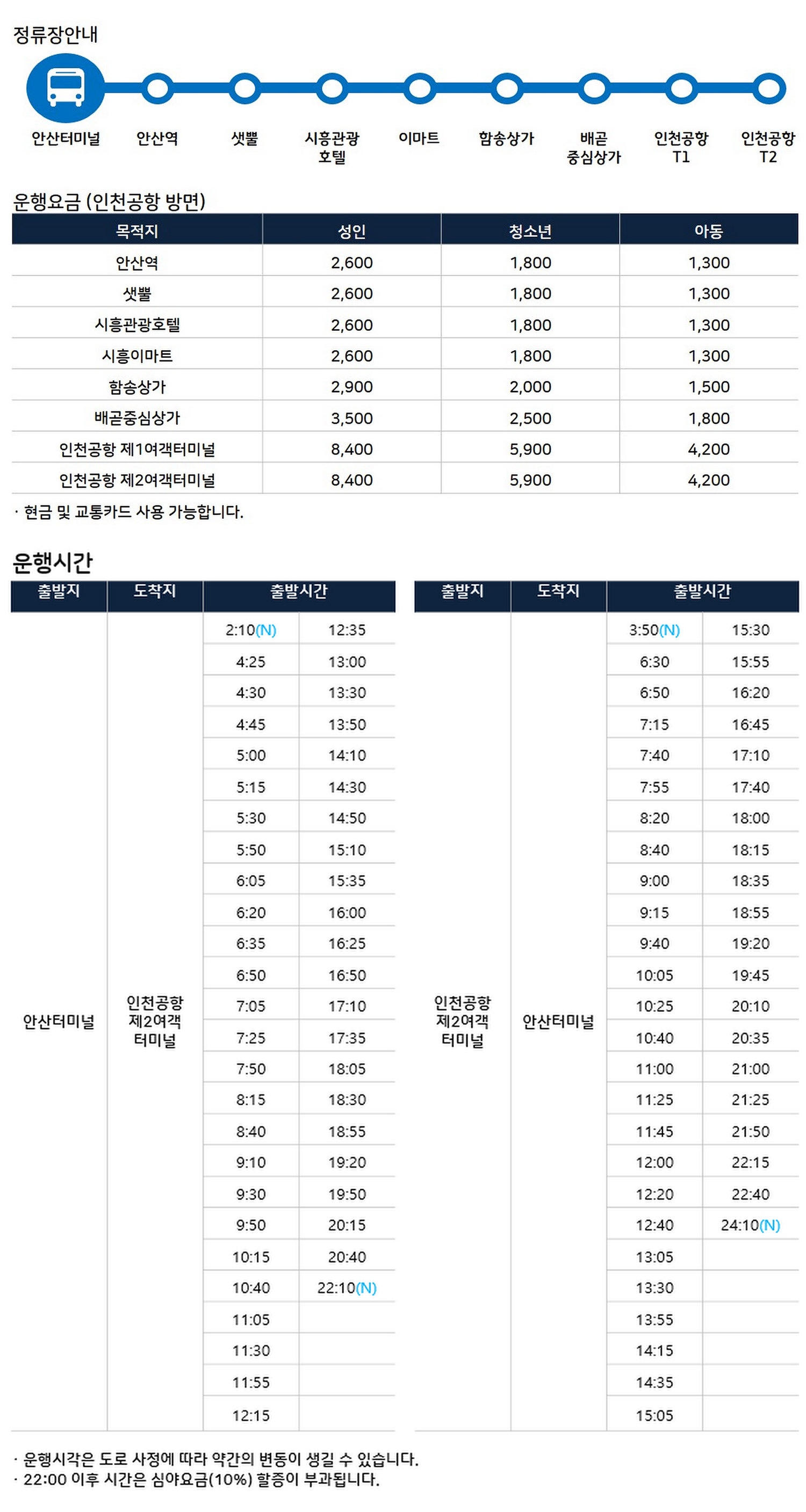인천공항2터미널 → 인천공항1터미널 → 배곧중심상가 → 함송상가 → 시화이마트 → 시흥관광호텔,시화초교 → 샛뿔 → 안산역 → 안산터미널