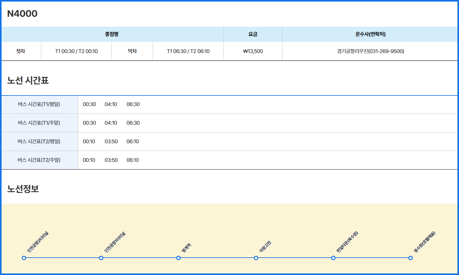 동수원 공항버스 정류장 → 한일타운 → 의왕(고천) → 안양(범계) → 인천공항 T1 → 인천공항 T2