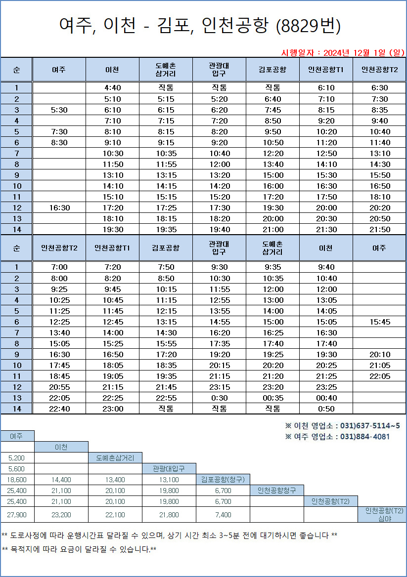 ▶ 인천공항2터미널 → 인천공항1터미널 → 김포공항 → 한국관광대 → 도예촌삼거리 → 이천 → 여주