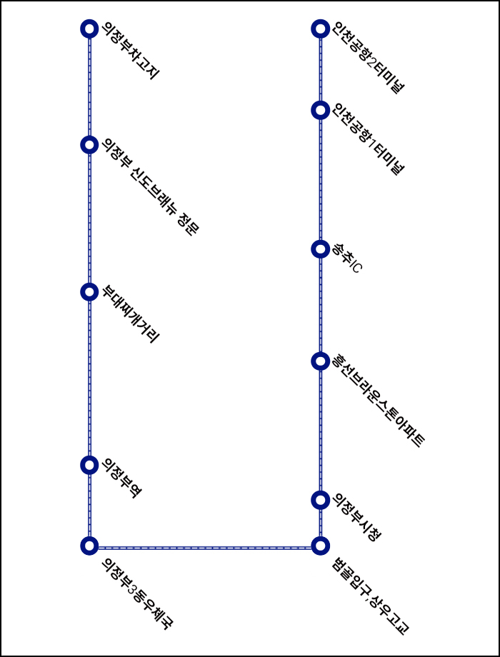 인천공항2터미널 → 인천공항1터미널 → 송추IC → 흥선브라운스톤아파트 → 의정부시청 → 범골입구,상우고교 → 의정부3동우체국 → 의정부역 → 부대찌개거리 → 의정부 신도브래뉴 정문 → 의정부차고지