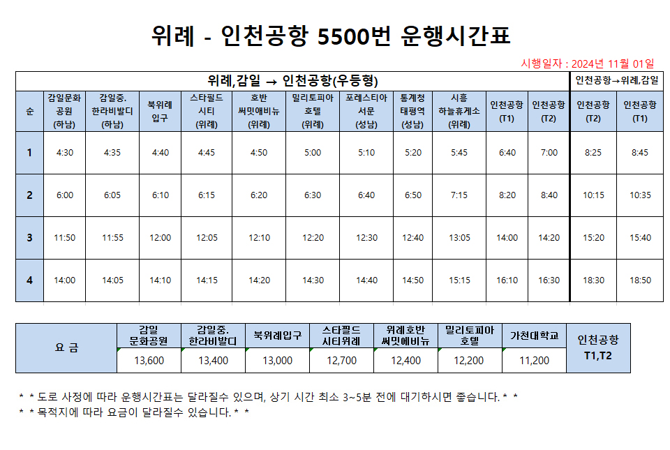 ▶ 인천공항 ↔ 감일문화공원 5500 운행시간표