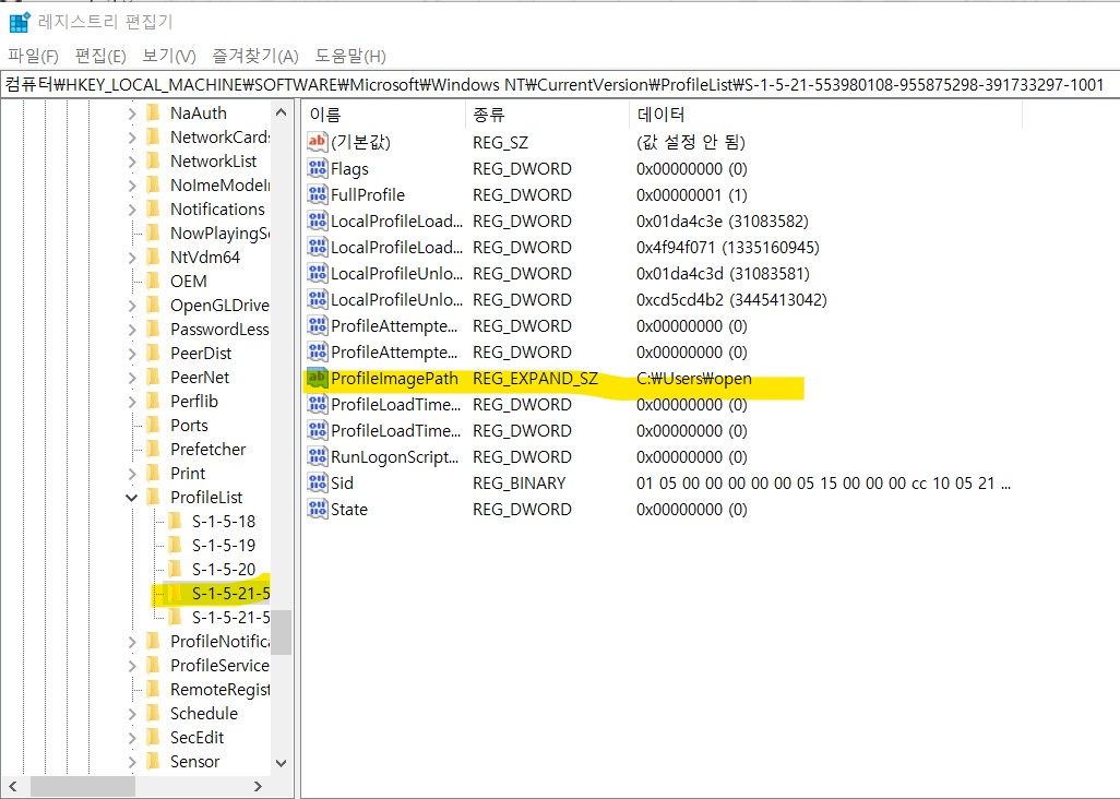 하부 폴더를 하나씩 방문해 ProfileImagePath 항목을 확인해 기존 폴더 이름을 찾아, 원하는 이름으로 변경하고, 레지스트리 편집기를 종료한다.