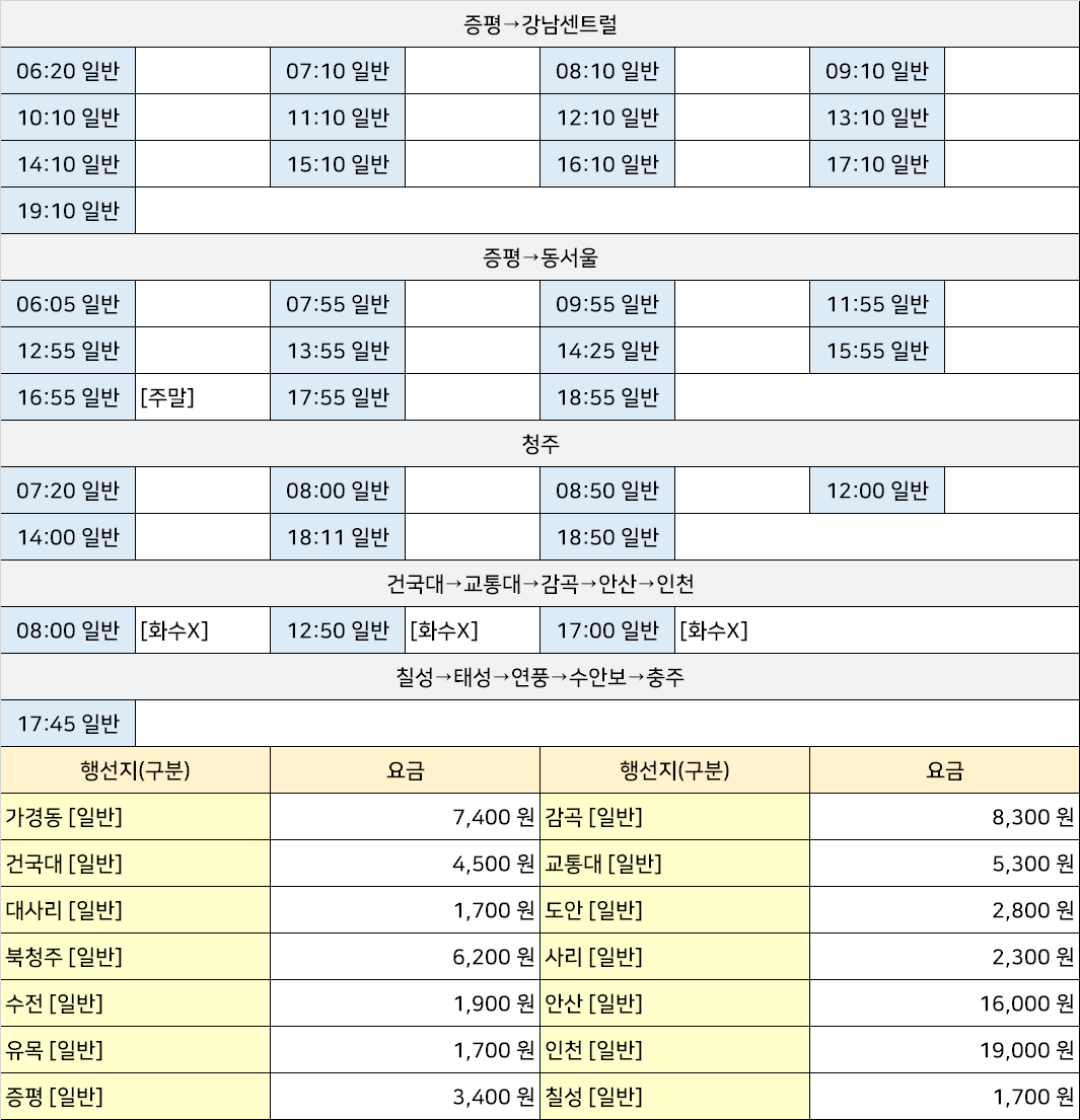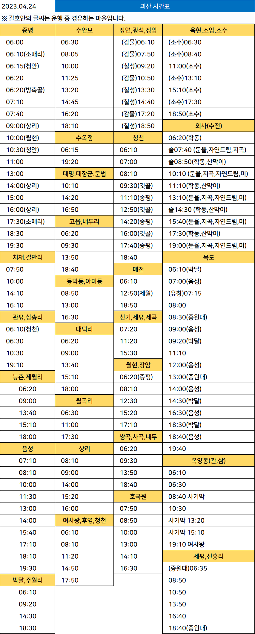 괴산 시외버스 터미널 시간표/요금표 2025년 05월 17일 기준 시간표