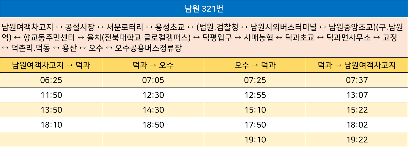 남원 321번: 남원여객차고지 ↔ 공설시장 ↔ 서문로터리 ↔ 용성초교 ↔ (법원.검찰청 ↔ 남원시외버스터미널 ↔ 남원중앙초교)(구.남원역) ↔ 향교동주민센터 ↔ 율치(전북대학교 글로컬캠퍼스) ↔ 덕평입구 ↔ 사매농협 ↔ 덕과초교 ↔ 덕과면사무소 ↔ 고정 ↔ 덕촌리.덕동 ↔ 용산 ↔ 오수 ↔ 오수공용버스정류장