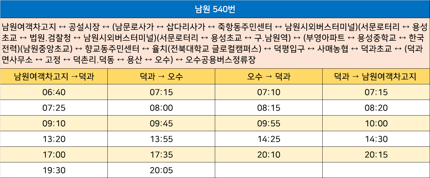 남원 540번: 남원여객차고지 ↔ 공설시장 ↔ (남문로사가 ↔ 삽다리사가 ↔ 죽항동주민센터 ↔ 남원시외버스터미널)(서문로터리 ↔ 용성초교 ↔ 법원.검찰청 ↔ 남원시외버스터미널)(서문로터리 ↔ 용성초교 ↔ 구.남원역) ↔ (부영아파트 ↔ 용성중학교 ↔ 한국전력)(남원중앙초교) ↔ 향교동주민센터 ↔ 율치(전북대학교 글로컬캠퍼스) ↔ 덕평입구 ↔ 사매농협 ↔ 덕과초교 ↔ (덕과면사무소 ↔ 고정 ↔ 덕촌리.덕동 ↔ 용산 ↔ 오수) ↔ 오수공용버스정류장