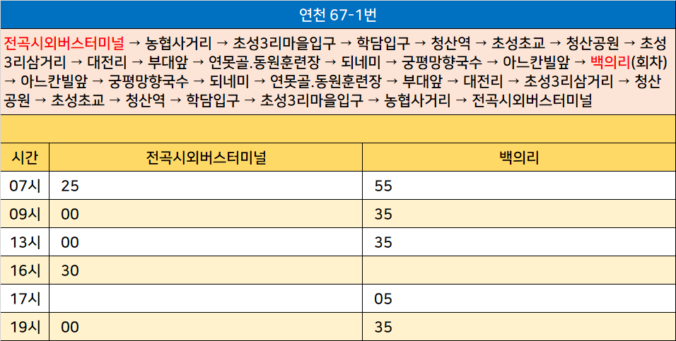 연천 67-1번: 전곡시외버스터미널 → 농협사거리 → 초성3리마을입구 → 학담입구 → 청산역 → 초성초교 → 청산공원 → 초성3리삼거리 → 대전리 → 부대앞 → 연못골.동원훈련장 → 되네미 → 궁평망향국수 → 아느칸빌앞 → 백의리(회차) → 아느칸빌앞 → 궁평망향국수 → 되네미 → 연못골.동원훈련장 → 부대앞 → 대전리 → 초성3리삼거리 → 청산공원 → 초성초교 → 청산역 → 학담입구 → 초성3리마을입구 → 농협사거리 → 전곡시외버스터미널
